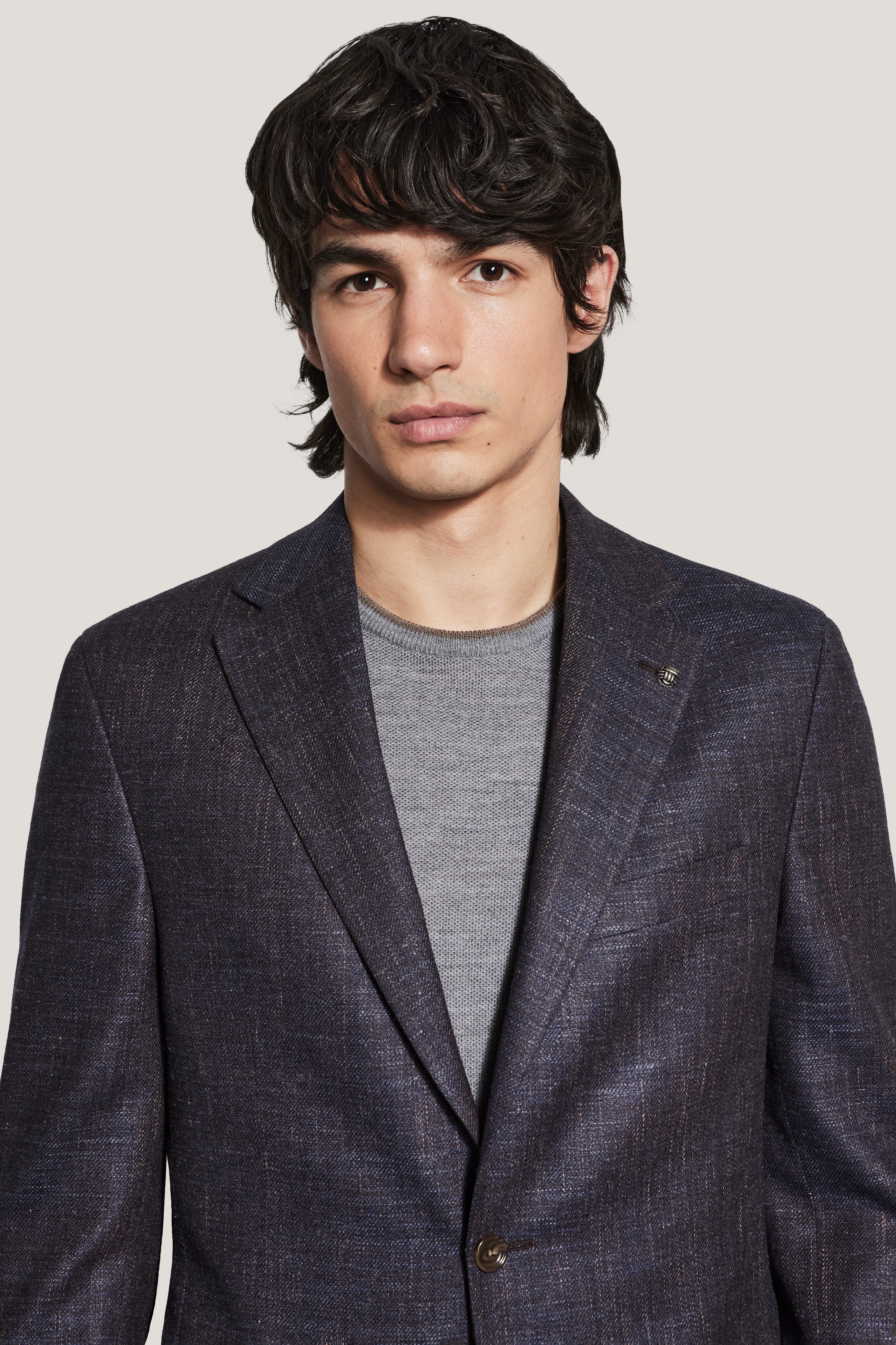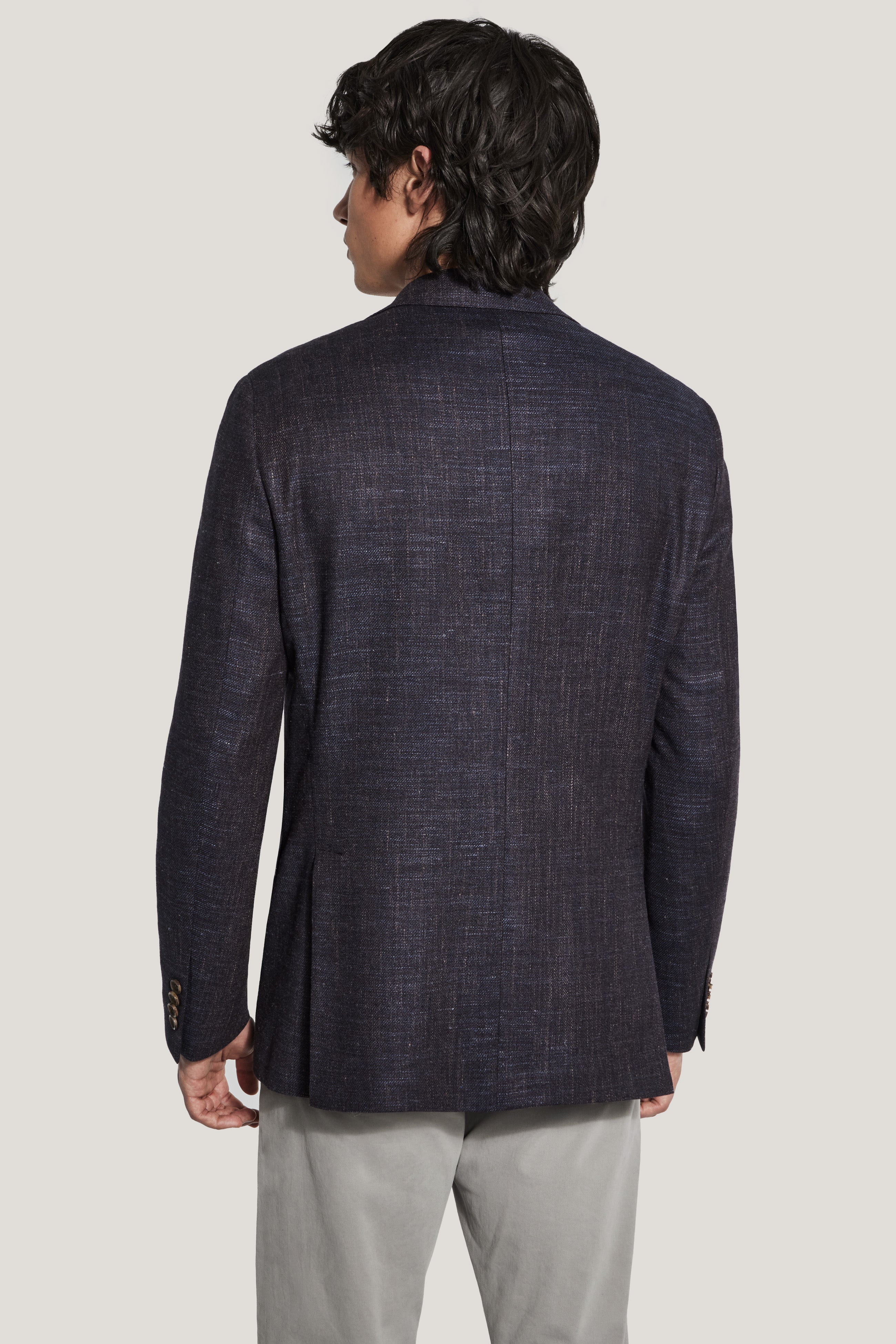 Crafted from a luxurious wool, silk, and linen stretch blend, this single breasted two button Midland blazer features a rich aubergine textured mélange, offering a refined yet relaxed look. With its year-round weight and natural stretch, this blazer provides all-day comfort and effortless versatility, perfect for pairing with a polo or sweater for a polished casual style. The unconstructed, half-lined interior ensures breathability and ease of movement, while the classic notch lapel, lower flap pockets, an upper welt breast pocket, and interior pockets add timeless functionality. Finished with inserted sleeves and fine pic-stitching, this blazer seamlessly transitions from day to night with understated sophistication.