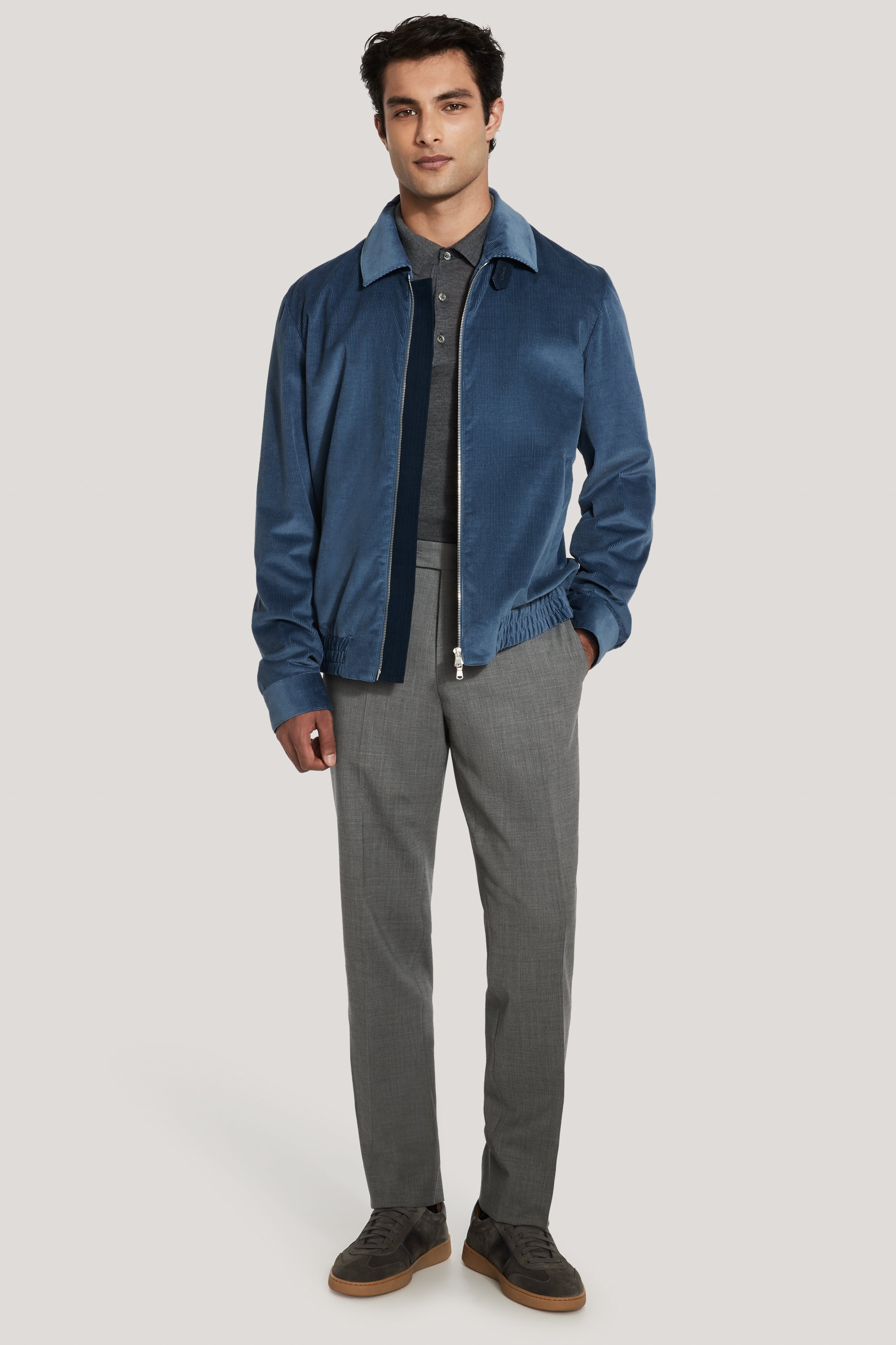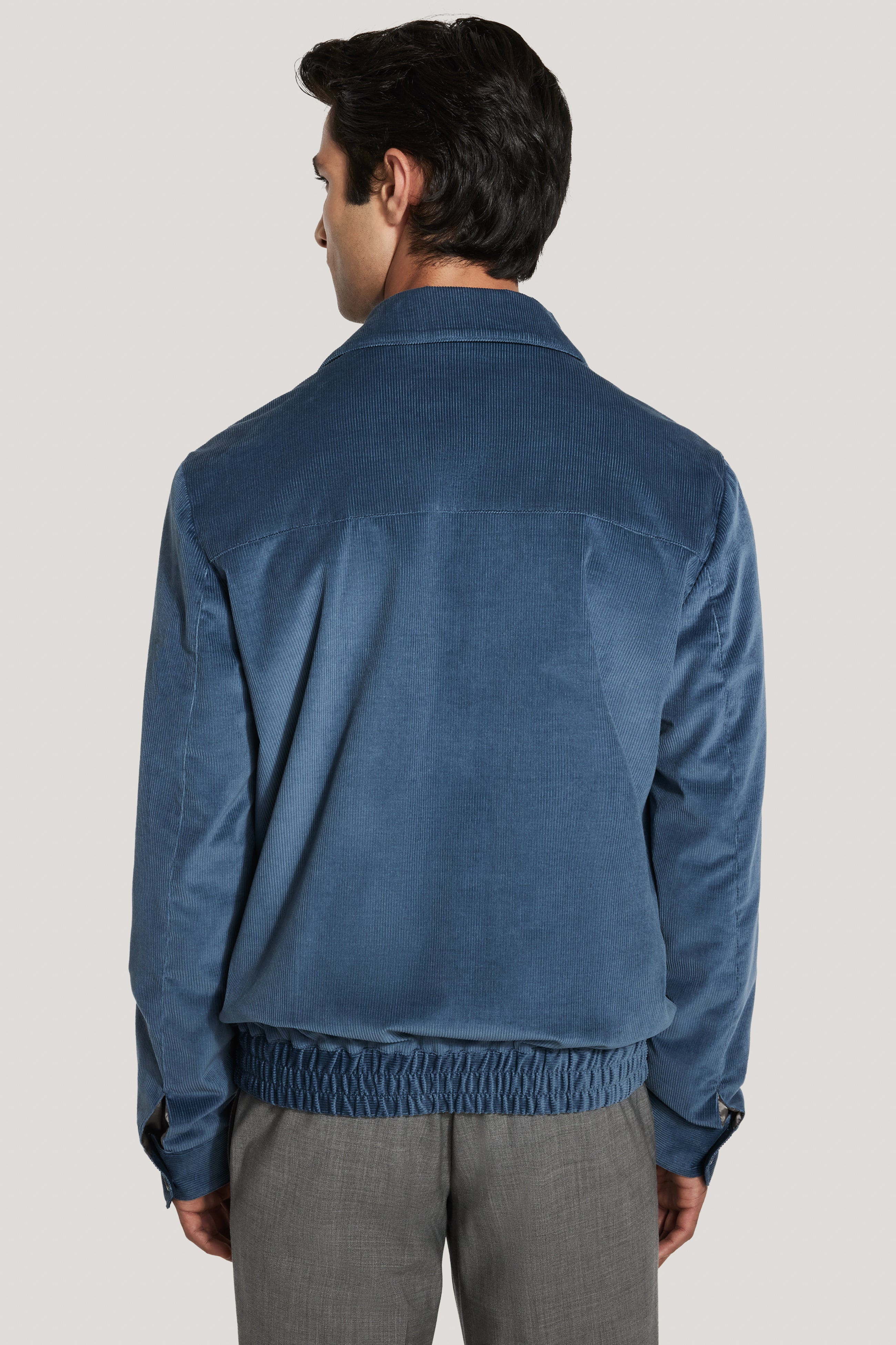 The Billy Bomber Jacket blends style and function with a lay-down collar, contrast moleskin undercollar, and extension tab detail. Made from Italian cotton-cashmere fine corduroy in a unique Vintage Blue color, it features an elasticated waistband, interior besom pockets, and a two-way front zipper for ease and versatility. A perfect balance of refined texture and rugged character.