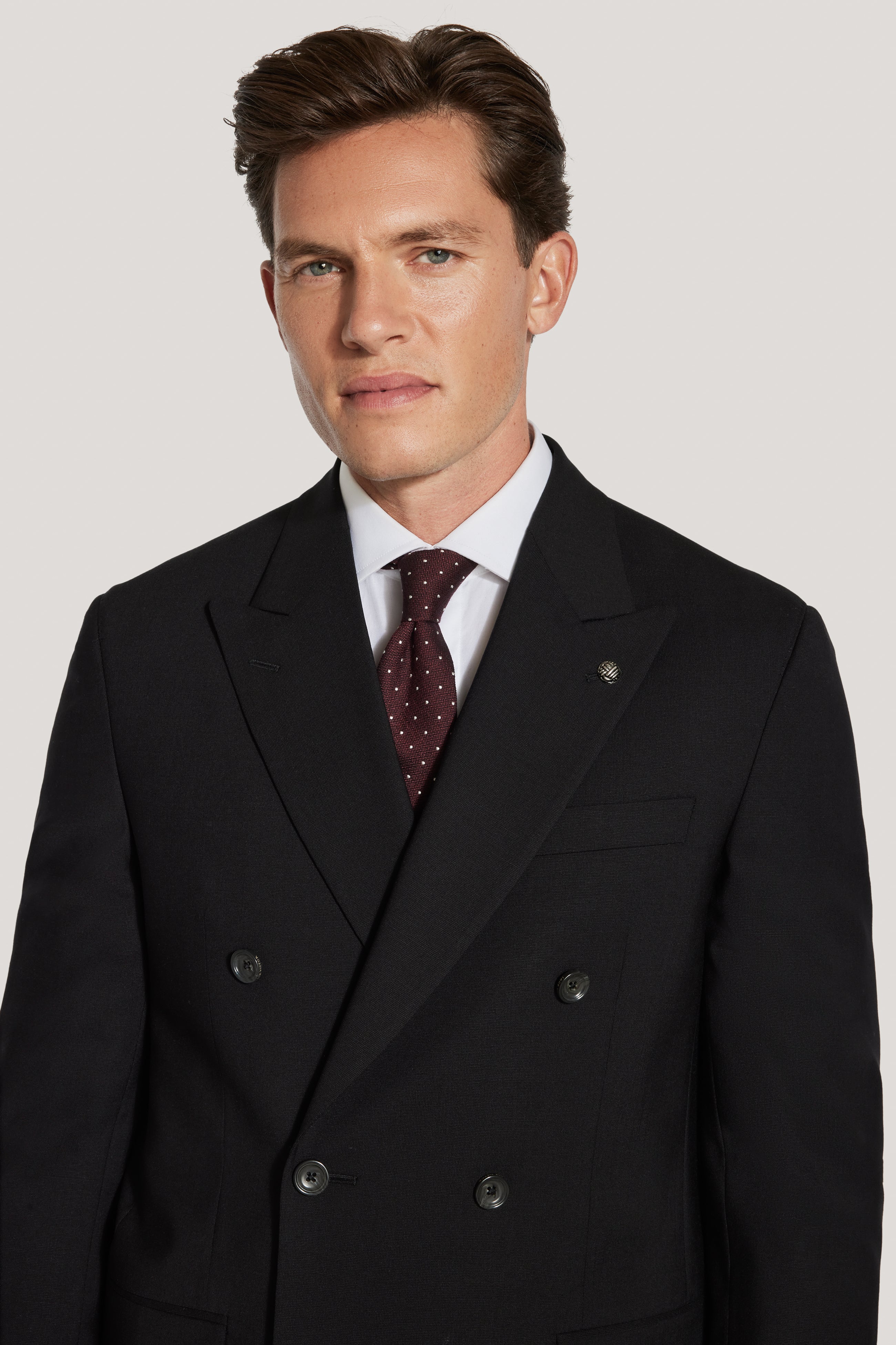 Part of the TEMPO Collection, the Martin black solid suit is designed for modern comfort and effortless style, crafted from a 98% wool and 2% Lycra blend woven as a Bengaline that offers natural stretch and ease of movement. This double-breasted 3 x 2 jacket features a peak lapel, lower flap pockets, an upper welt breast pocket, and interior pockets for a clean, tailored look. With its unconstructed, half-lined design and inserted sleeve with pic-stitching, it delivers a relaxed yet refined silhouette. Ideal for long days or travel, this suit combines elevated tailoring with exceptional comfort.