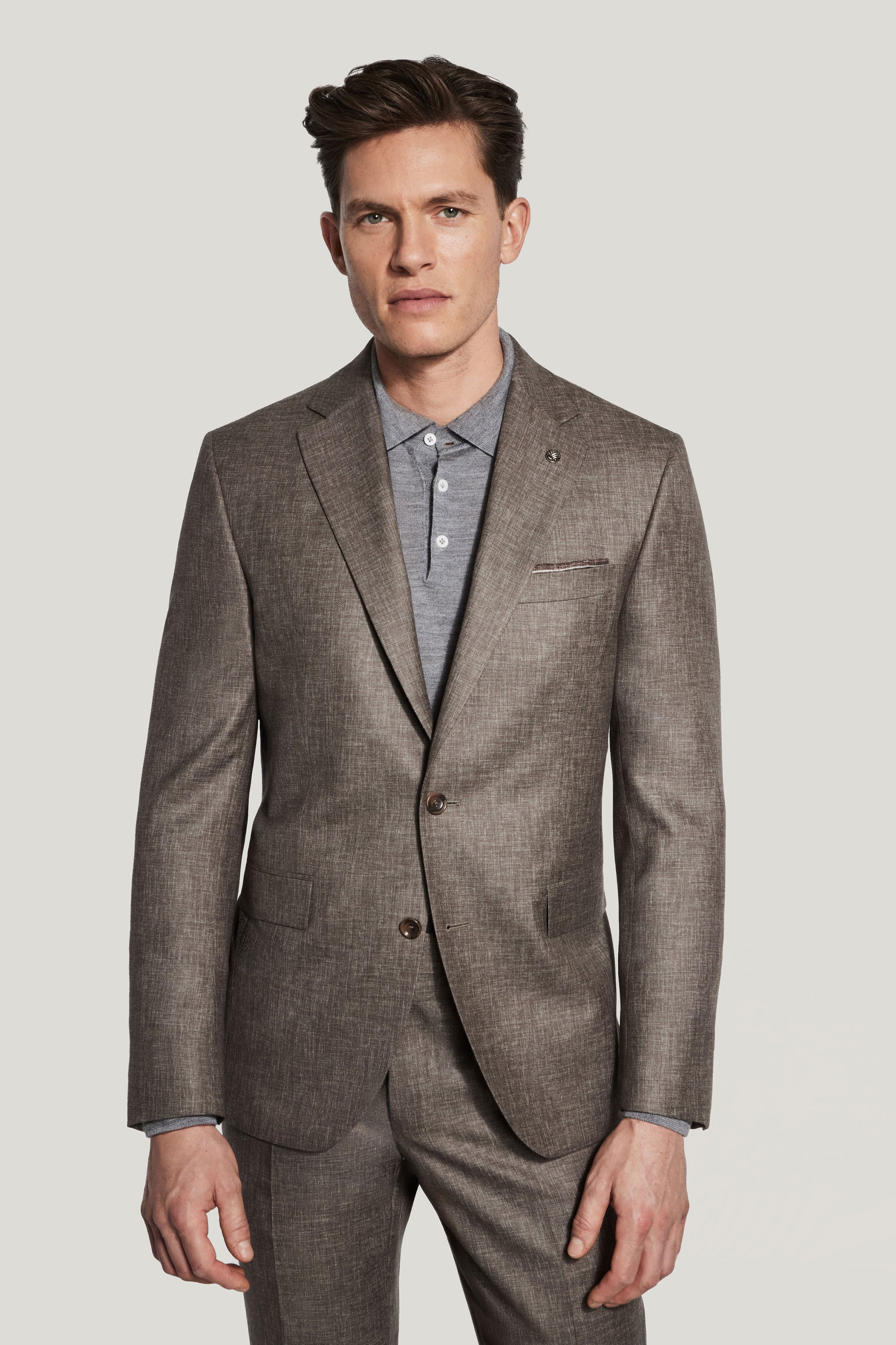 Crafted from pure Super 120’s wool, this single breasted two button Esprit suit offers a refined brown mélange look created through sprayed yarn for a sophisticated linen-like texture. Designed for year round wear, its supersoft fabric provides all day comfort with a polished, versatile appeal that transitions effortlessly from day to night. Featuring a classic notch lapel, lower flap pockets, an upper welt breast pocket, and interior pockets, this suit blends timeless tailoring with modern ease. The soft construction and full lining ensure a structured yet comfortable fit.