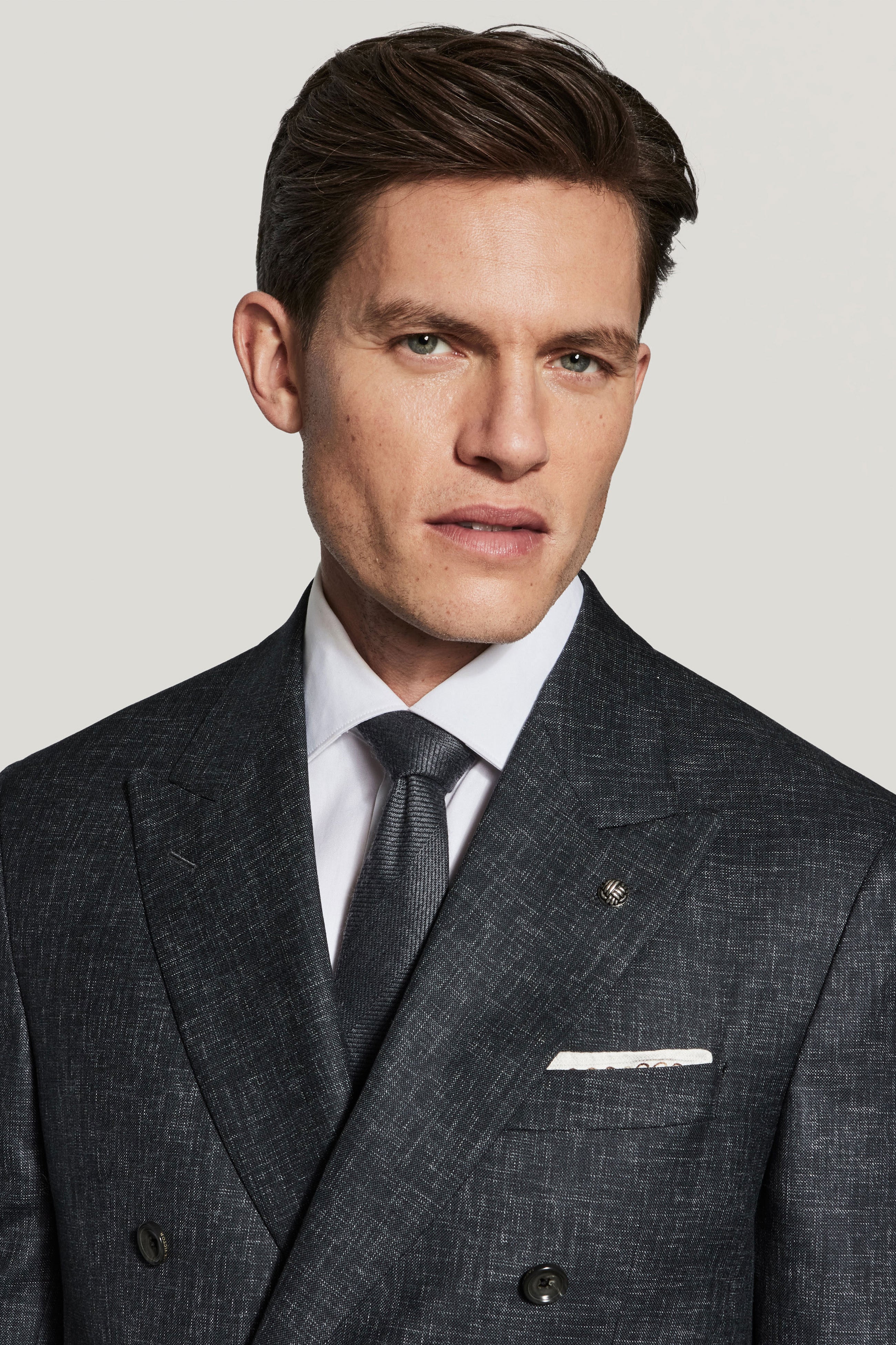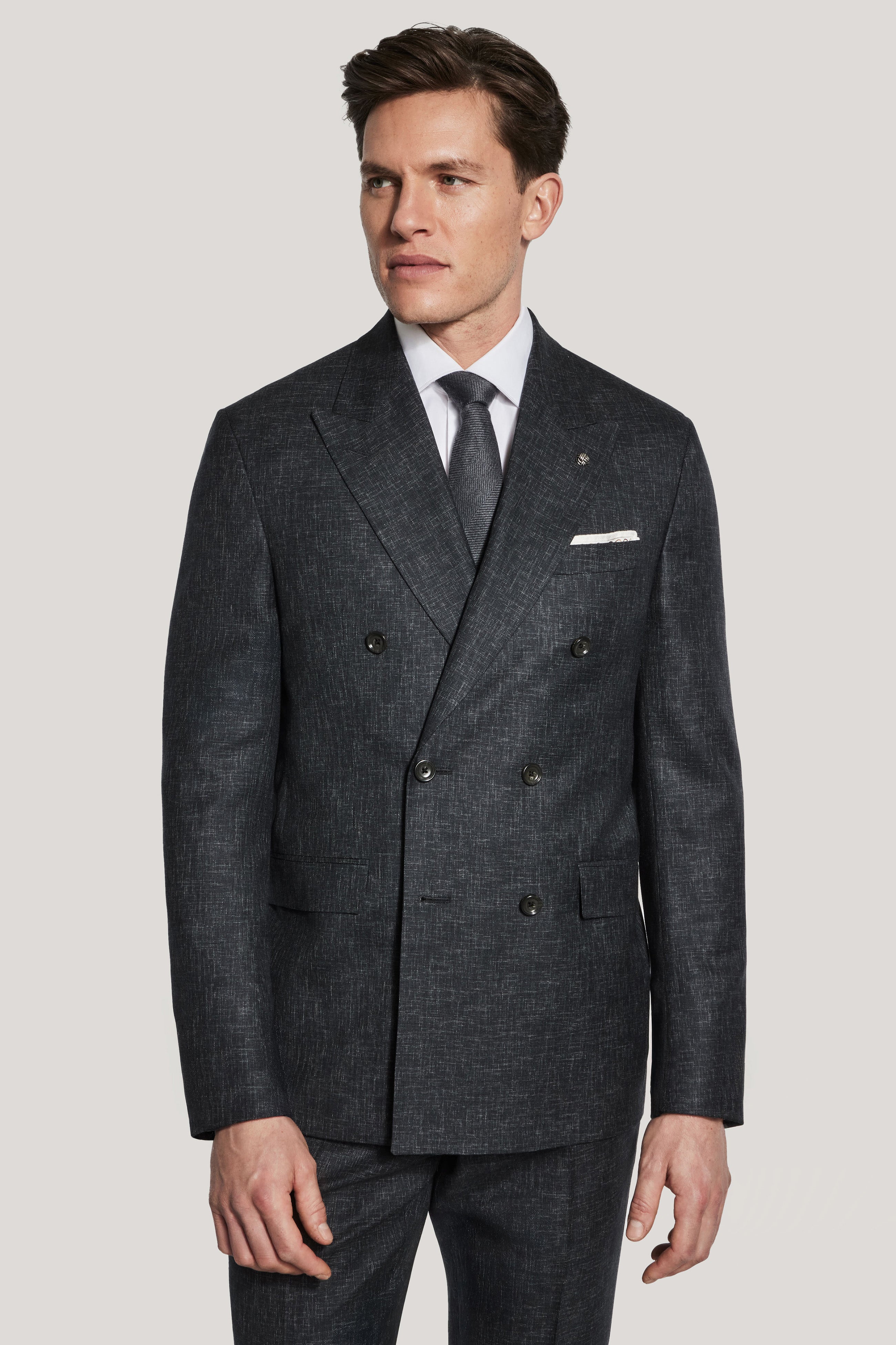 Crafted from pure Super 120’s wool, this double breasted 3 x 2 Martin suit exudes effortless sophistication with its charcoal mélange finish, achieved through sprayed yarn for a refined linen-like look. Designed for year-round wear, the supersoft, lightweight fabric ensures comfort from day to night, while the unconstructed, half-lined design offers breathability and ease of movement. Featuring a sharp peak lapel, lower flap pockets, an upper welt breast pocket, and interior pockets, this jacket seamlessly blends timeless style with modern versatility. Finished with inserted sleeves and fine pic-stitching, this is an elevated essential for any wardrobe.