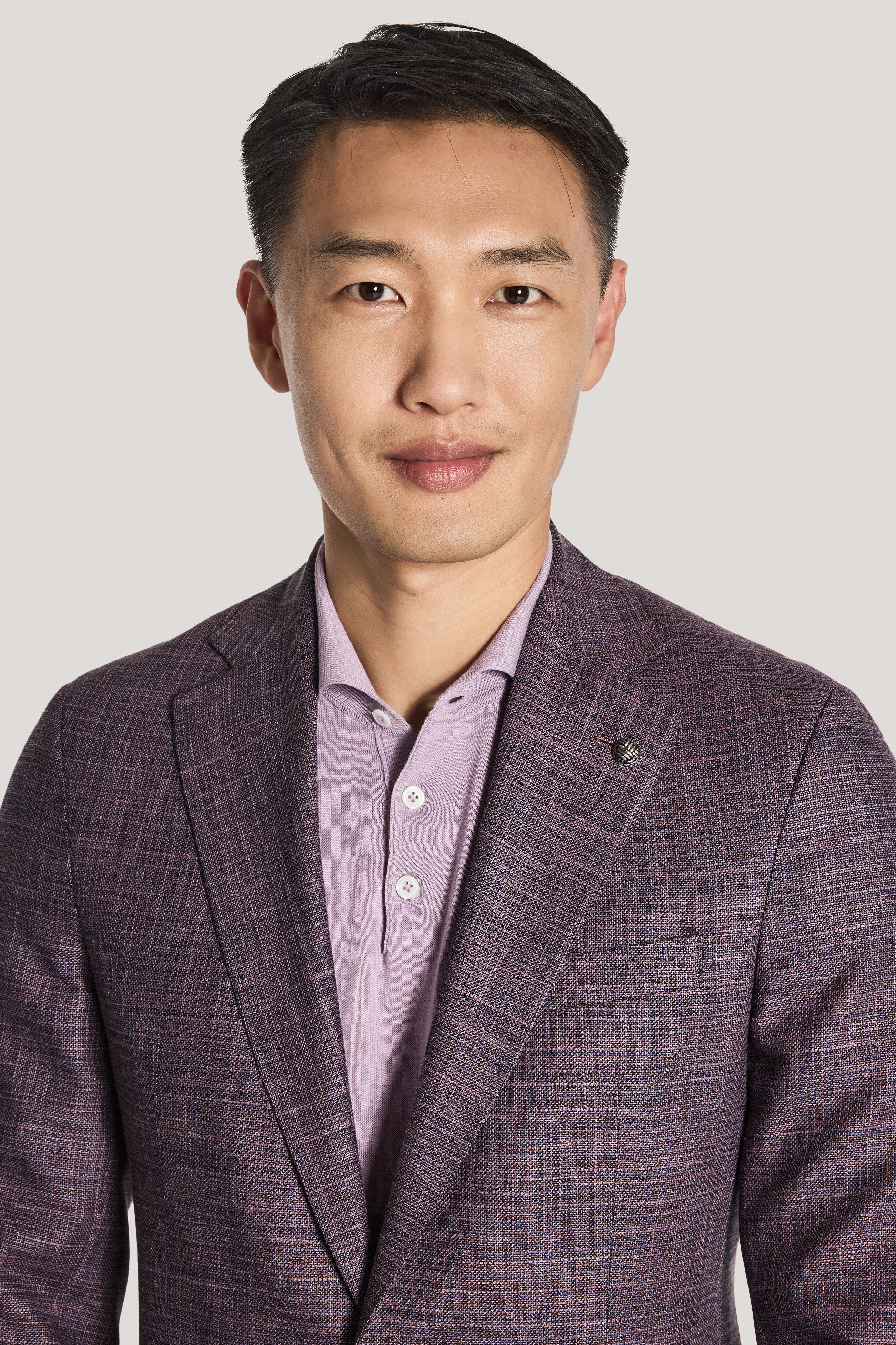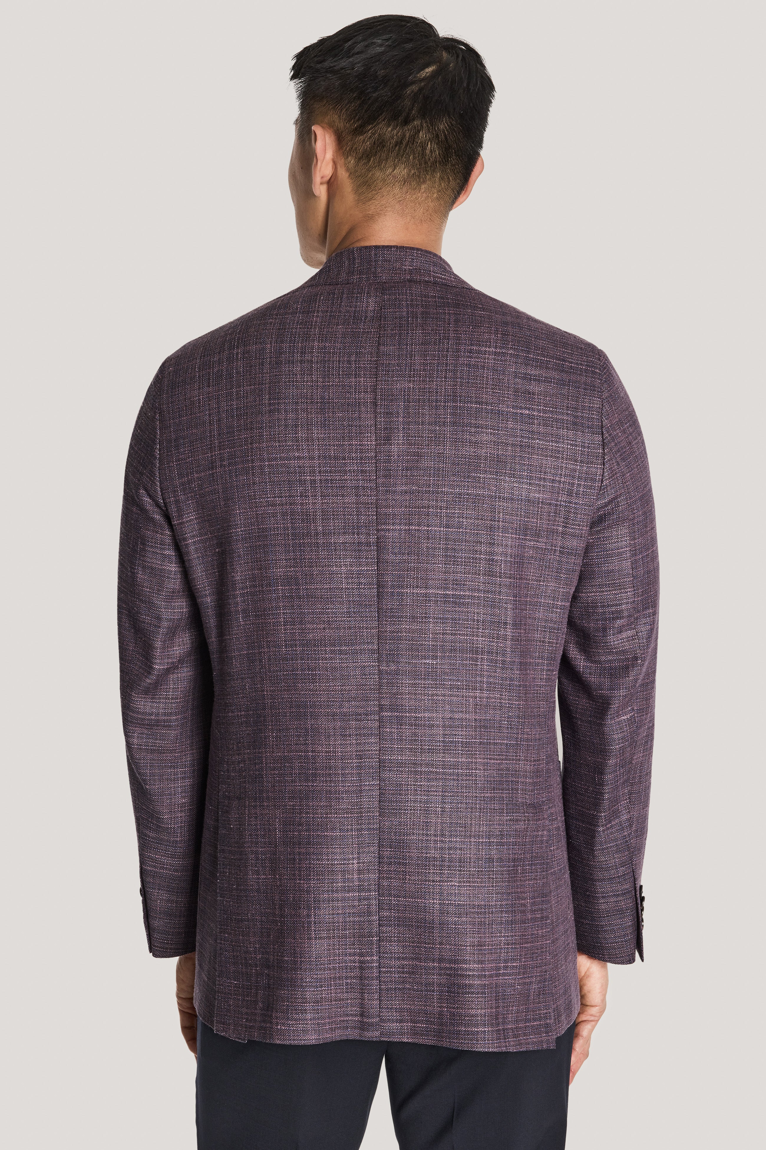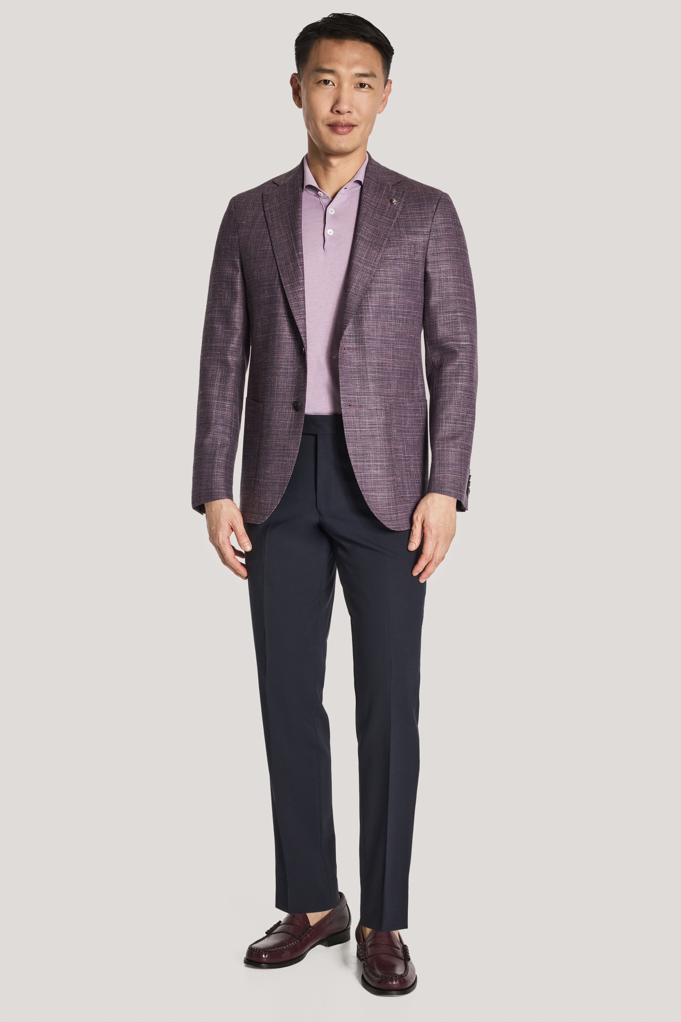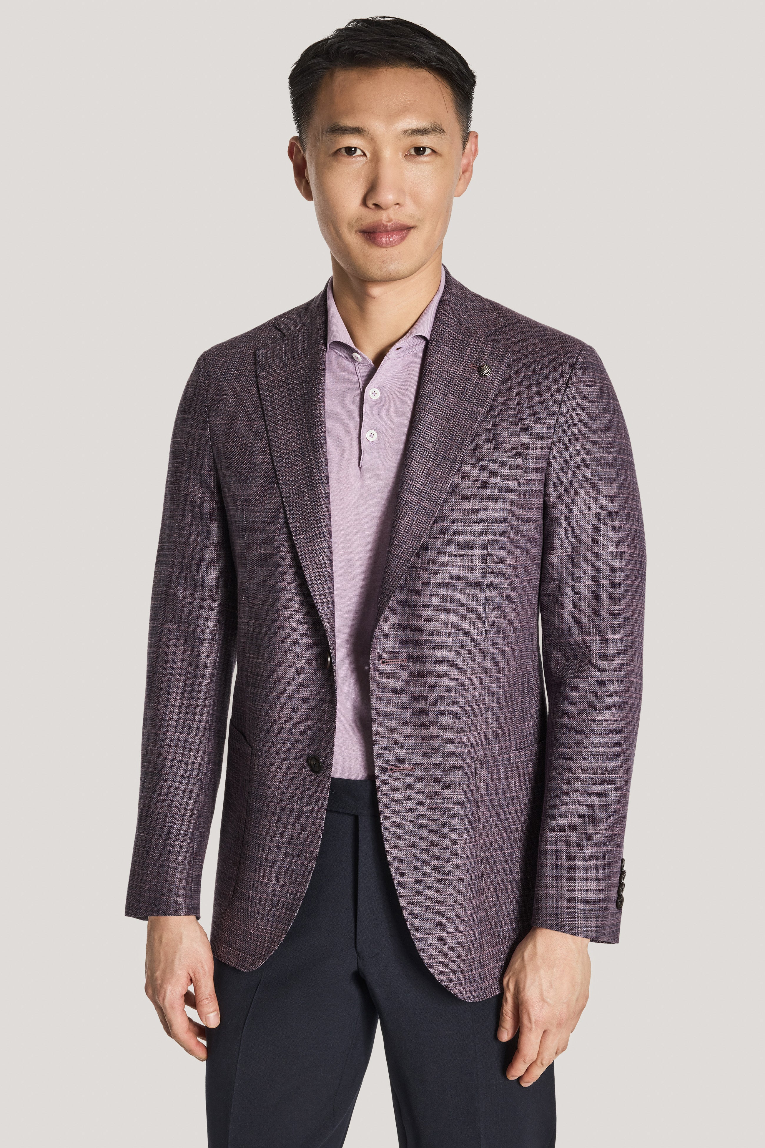 Crafted in a berry plaid design, this COMFORTWEAR™ Hampton blazer features fabric made in Italy from a wool, silk and linen blend by Loro Piana’s fabric division. The unconstructed, supersoft butterfly-lined interior ensures ease of movement along with added stretch. The notch lapel, lower patch pockets, an upper welt breast pocket, and interior pockets enhance both form and function. Featuring a summer weight, this is the perfect blazer for the season.