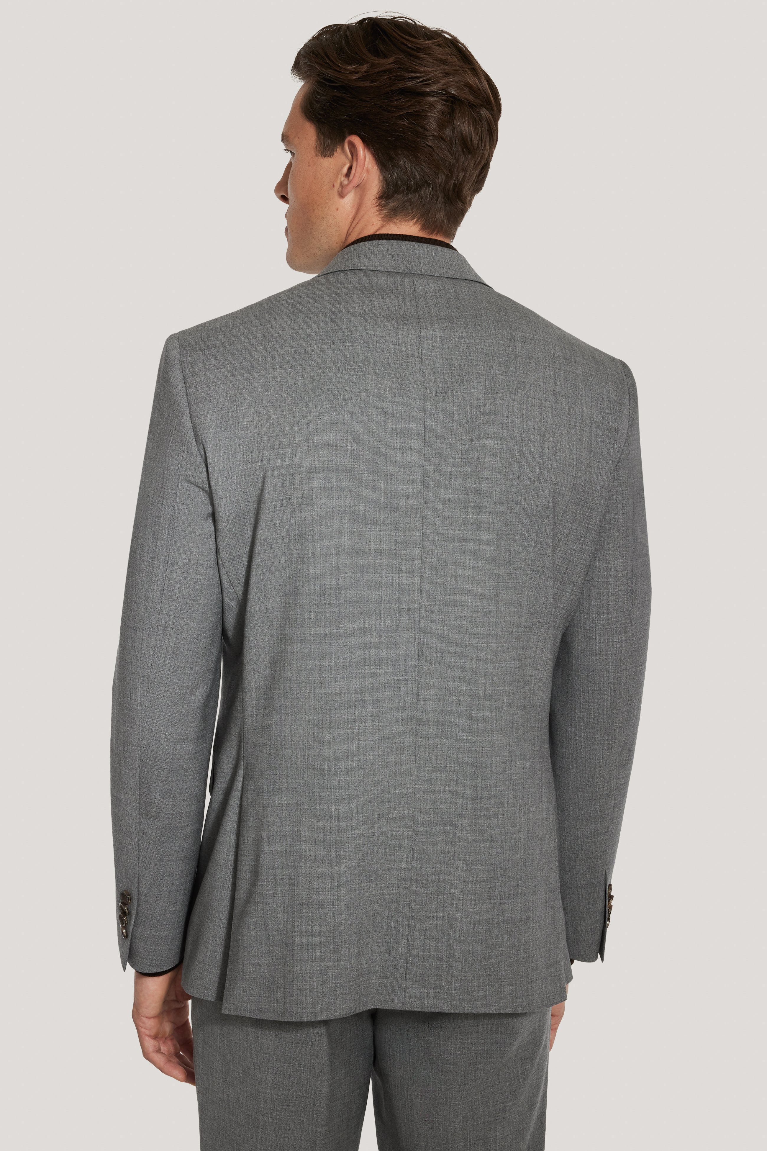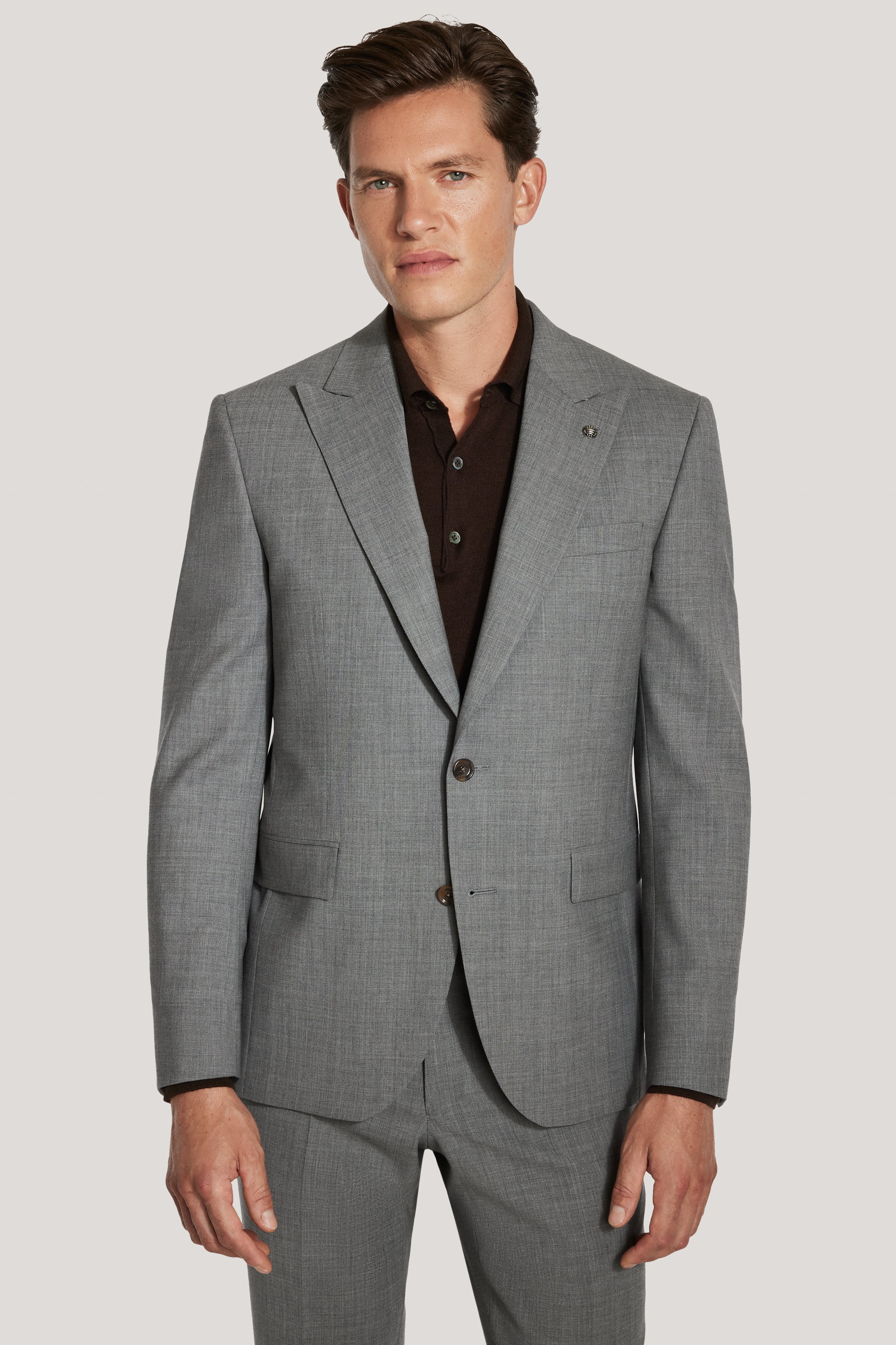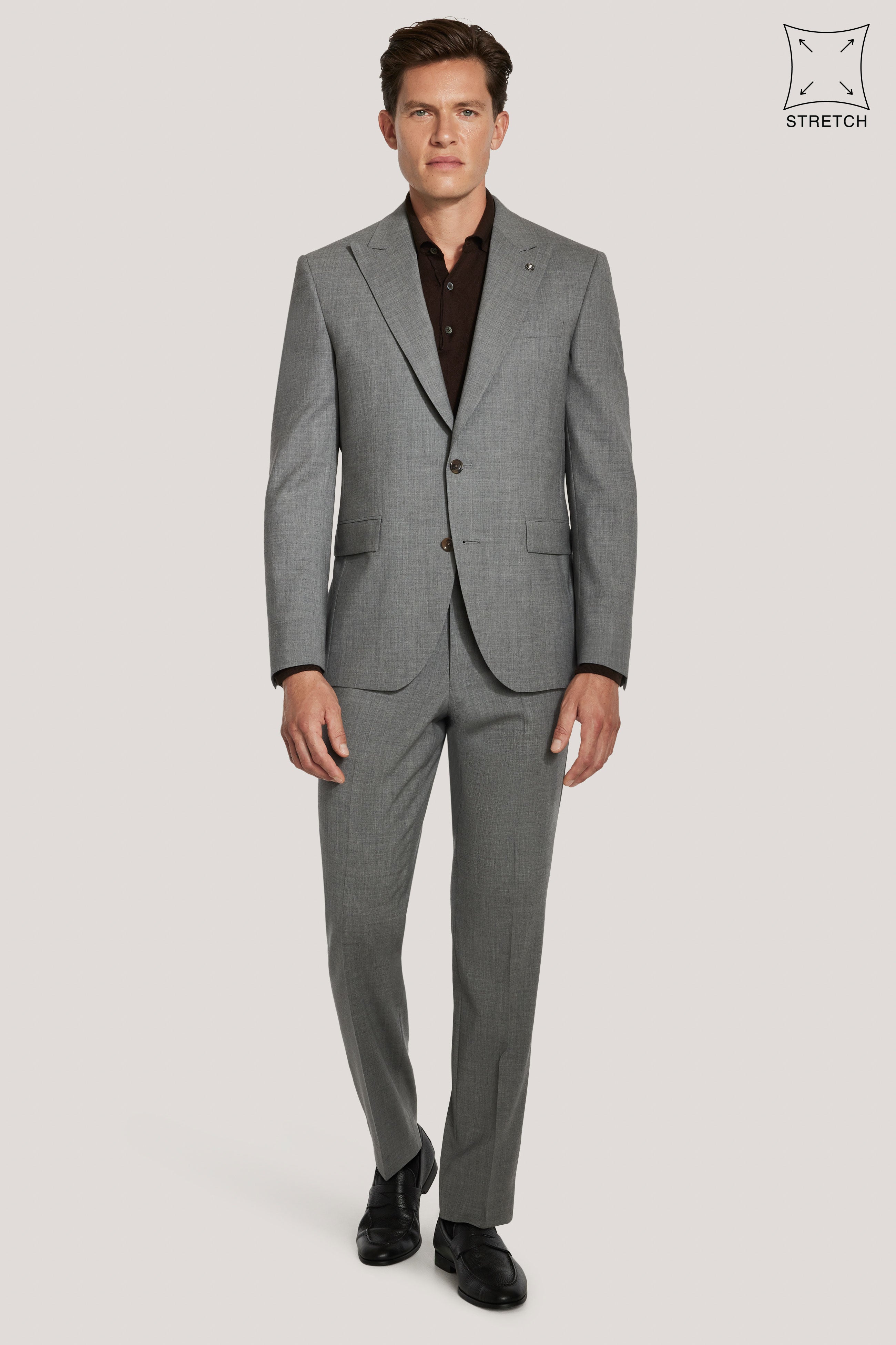 From the TEMPO Collection, this grey suit is tailored in the Engel model, offering a refined balance of comfort and structure. Crafted from a 98% wool and 2% Lycra blend woven as a Bengaline, it provides subtle stretch for ease of movement and all-day wear. The single-breasted, two-button jacket features a peak lapel, lower flap pockets, an upper welt breast pocket, and interior pockets, all finished with soft construction and a fully lined interior for a polished, modern silhouette. Ideal for both professional and formal settings, this suit delivers timeless style with everyday comfort.