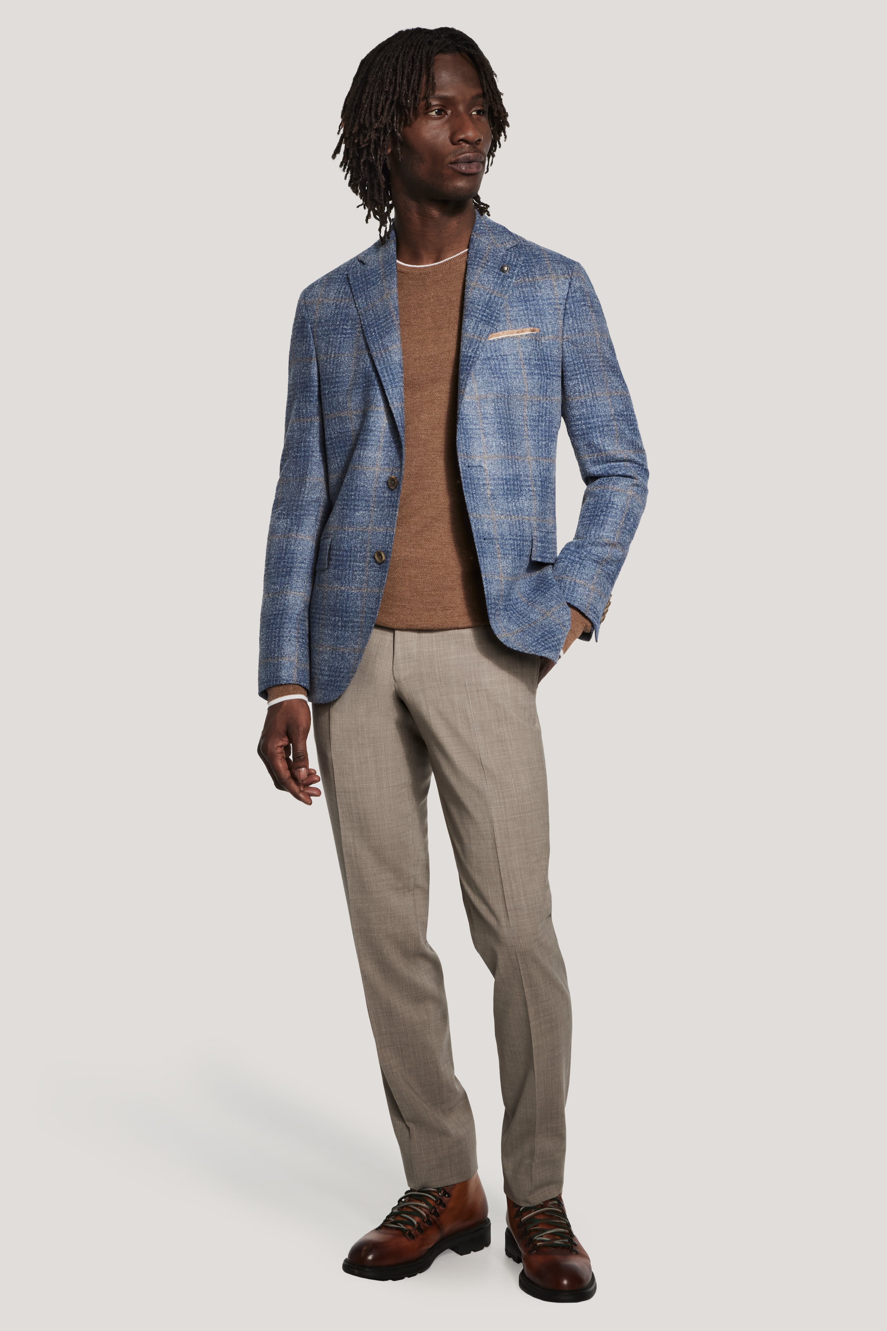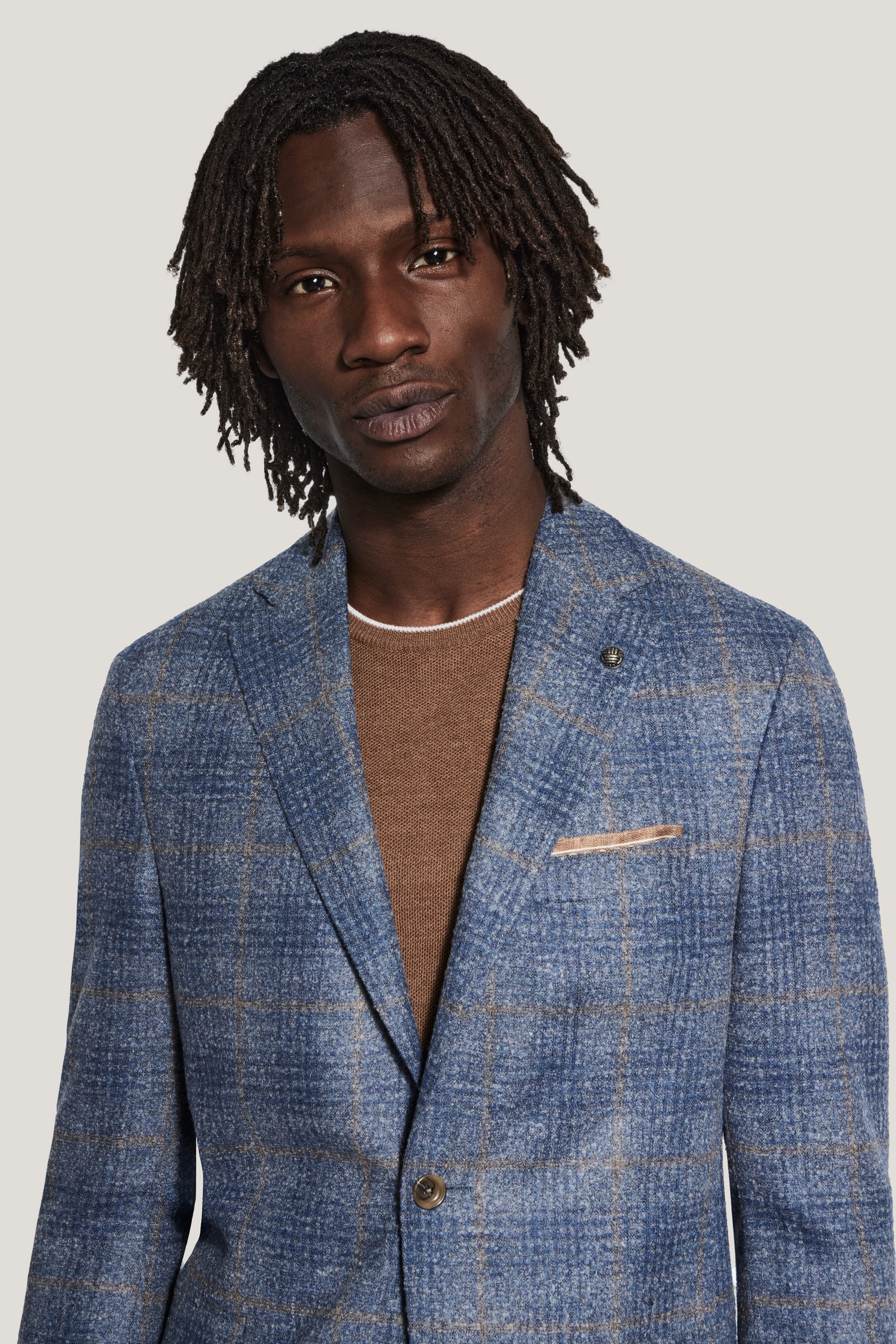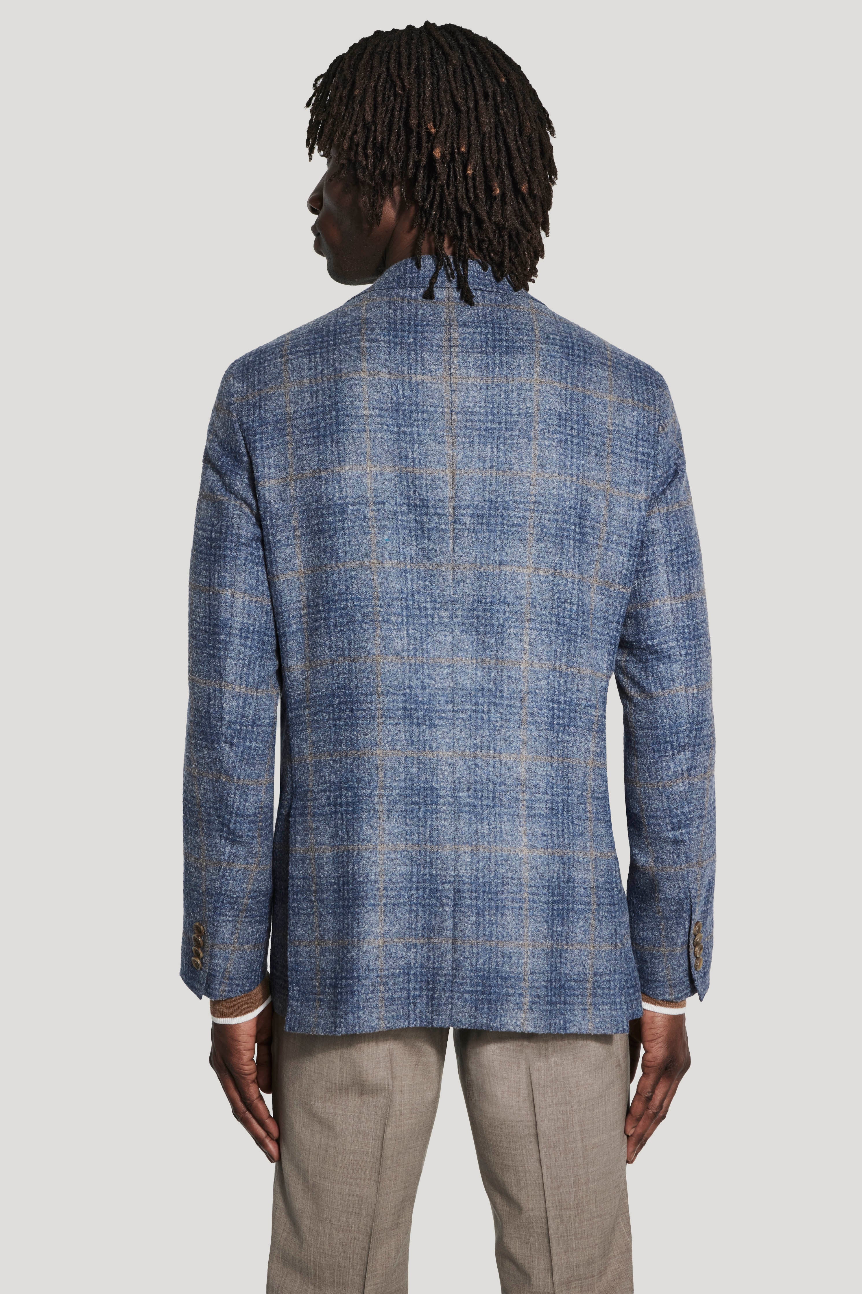Crafted from a luxurious Alpaca and Wool blend by Loro Piana, this single breasted two button McAllen blazer showcases a refined light blue and camel plaid with a distinctive bouclé texture for a rich, tactile feel. Designed with a heavier winter look, it offers warmth and elegance, making it the perfect layering piece for high-end sportswear. The unconstructed soft sartorial construction ensures a relaxed yet sophisticated drape, while the half-lined interior provides comfort and breathability. Featuring a notch lapel, lower flap pockets, an upper welt breast pocket, and interior pockets, this blazer is a statement of craftsmanship and timeless style, ideal for elevated seasonal dressing.