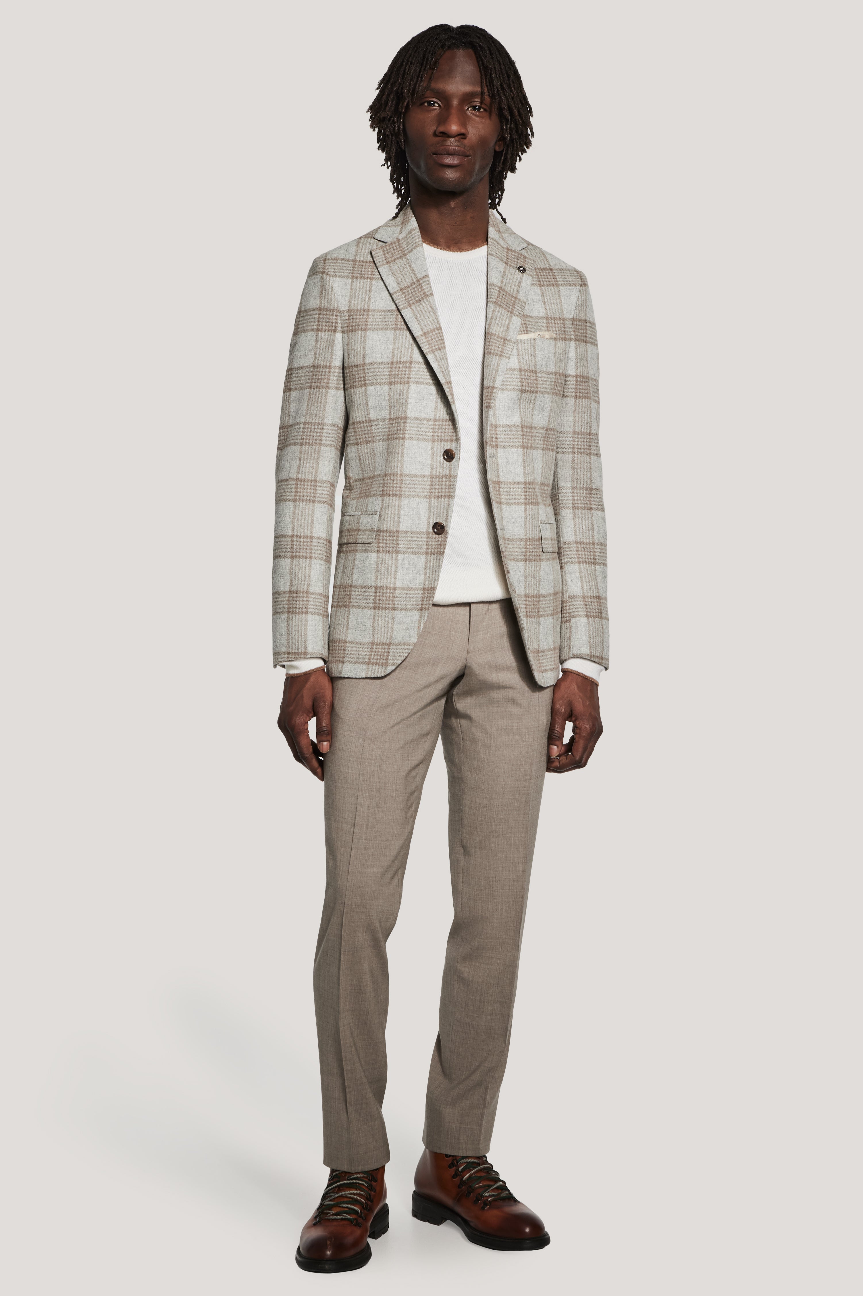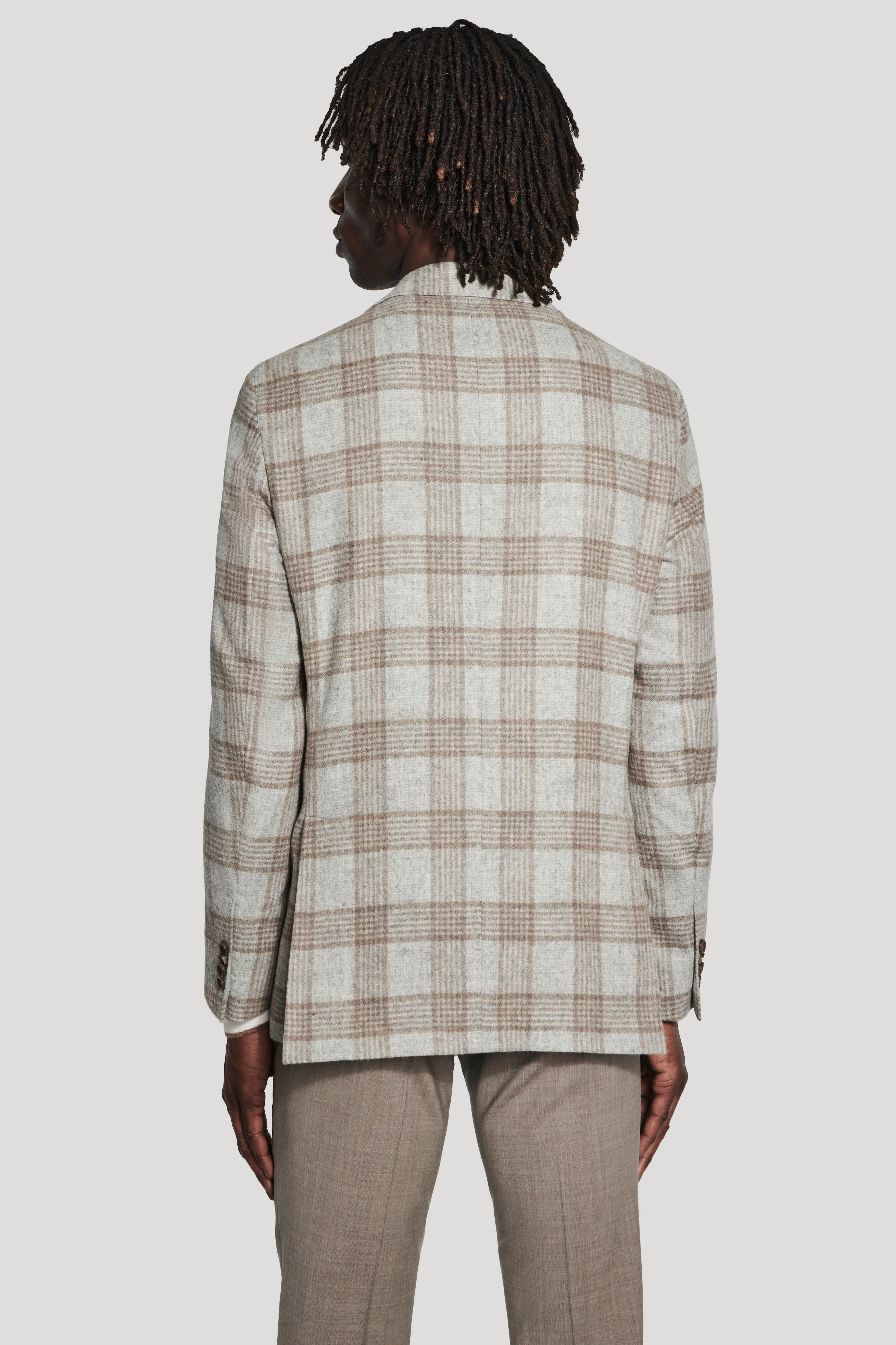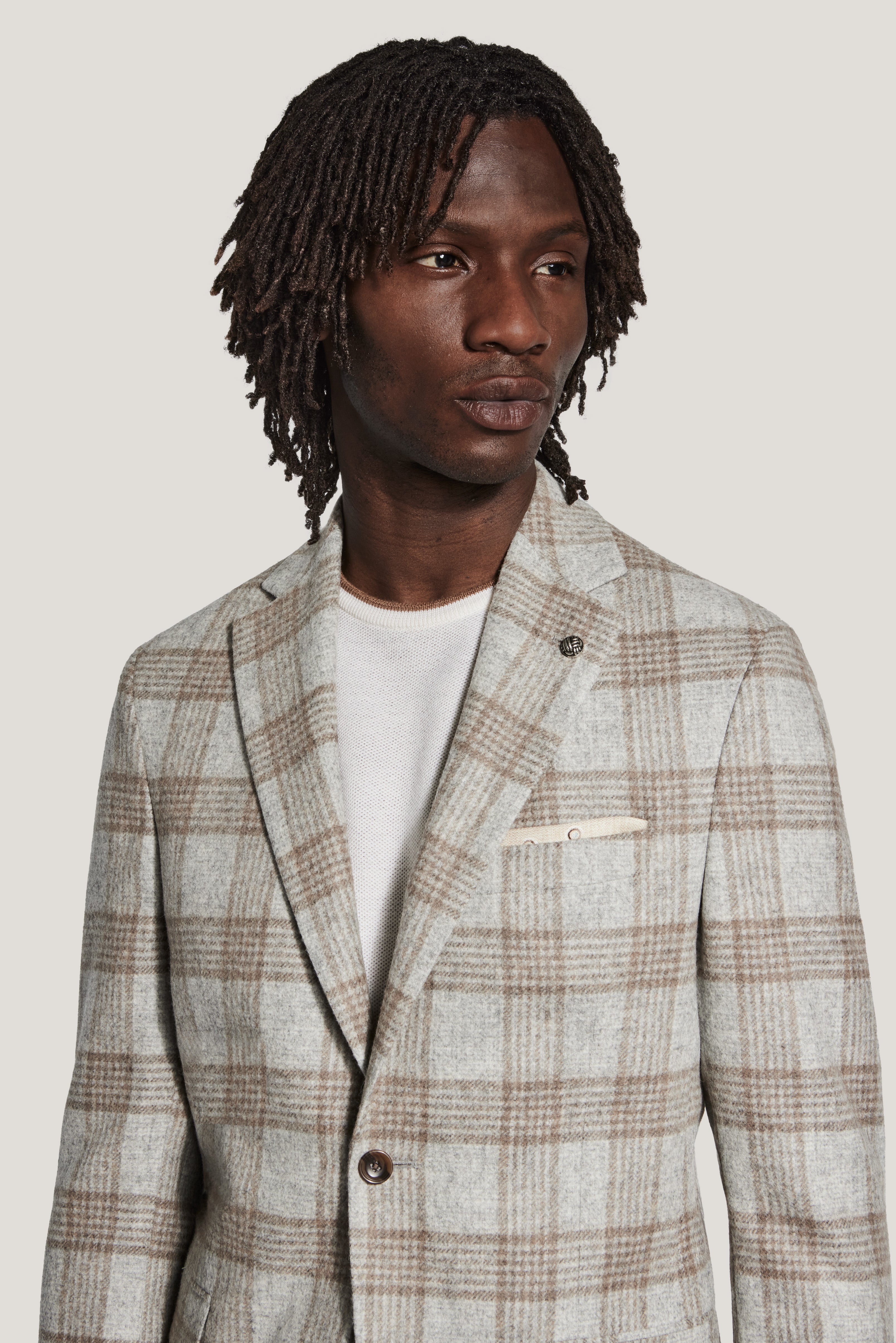 Crafted from a premium Alpaca and Wool McAllen blend, this single breasted two button blazer features a refined light grey with camel plaid, offering a milled texture for a rich, heavier look. Designed for luxurious and sophisticated styling, it’s the perfect layering piece to pair with high-end sportswear. The unconstructed soft sartorial construction provides a relaxed yet elevated drape, while the half-lined interior ensures breathability and comfort. Thoughtfully finished with a notch lapel, lower flap pockets, an upper welt breast pocket, and interior pockets, along with inserted sleeves and fine pic-stitching, this blazer embodies timeless craftsmanship with modern versatility.