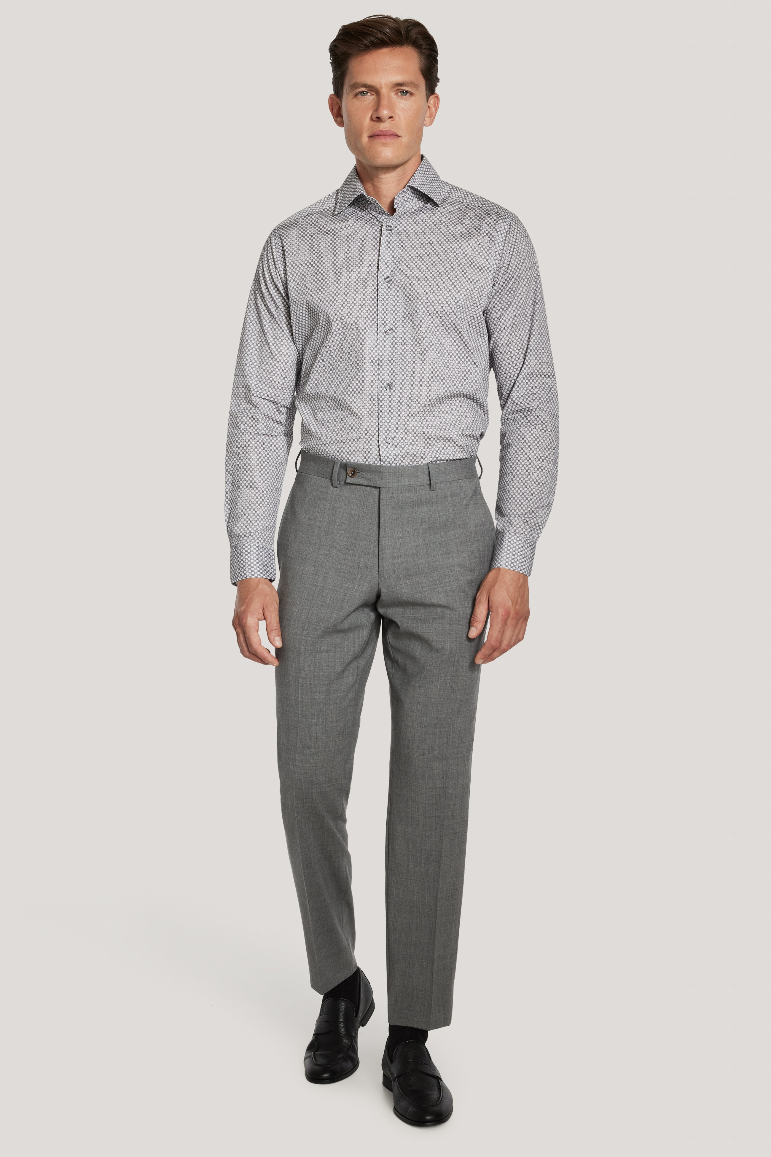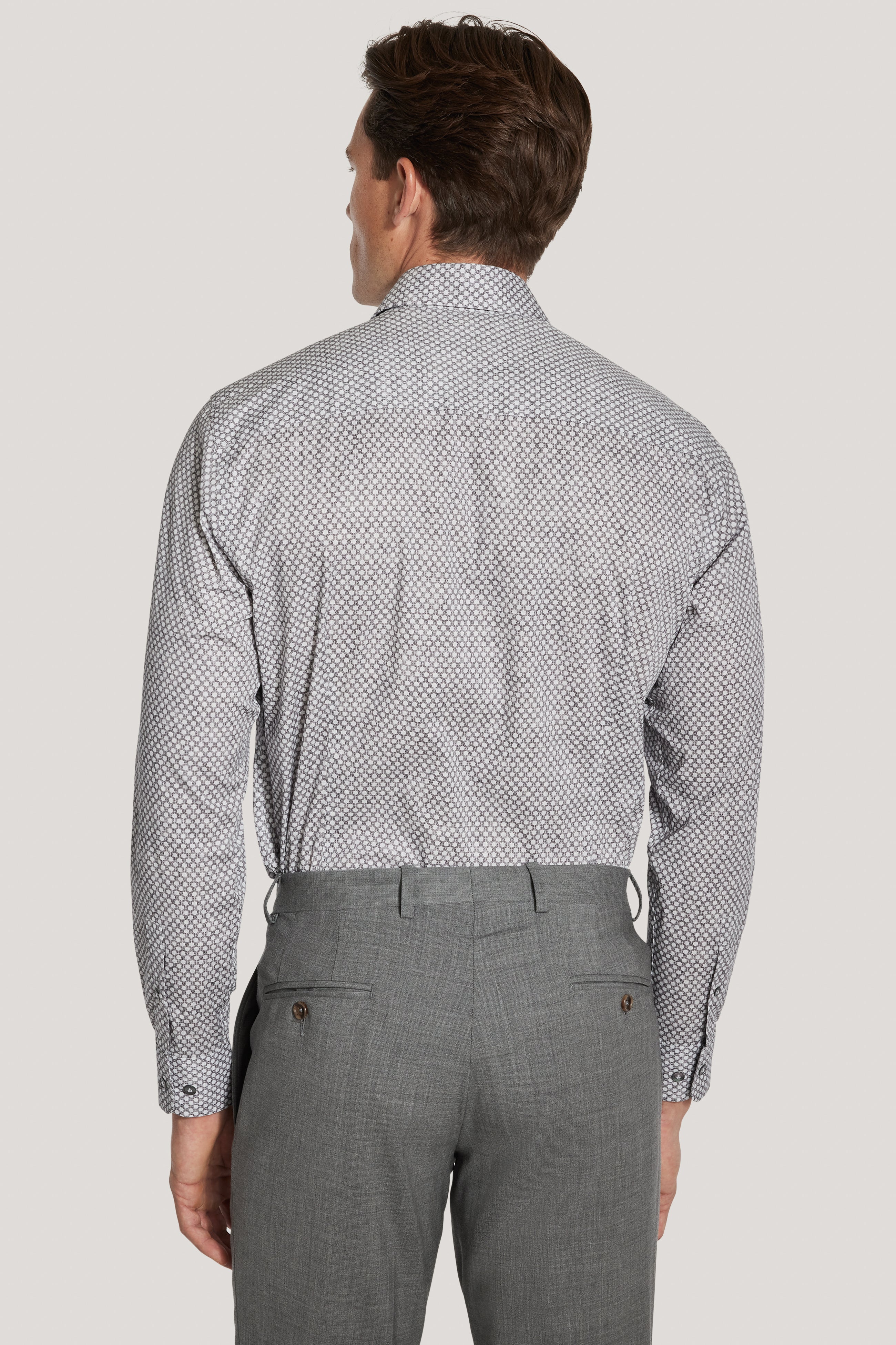 This grey geo print sport shirt is made from a luxurious cotton blend, offering subtle stretch for all-day comfort and mobility. Designed for year-round wear, it features a contemporary fit with back darts for a clean, tailored silhouette. The semi-spread collar adds versatility, making it easy to dress up or down, while the signature Jack Victor button stitch adds a refined finishing touch. A modern essential with timeless appeal.