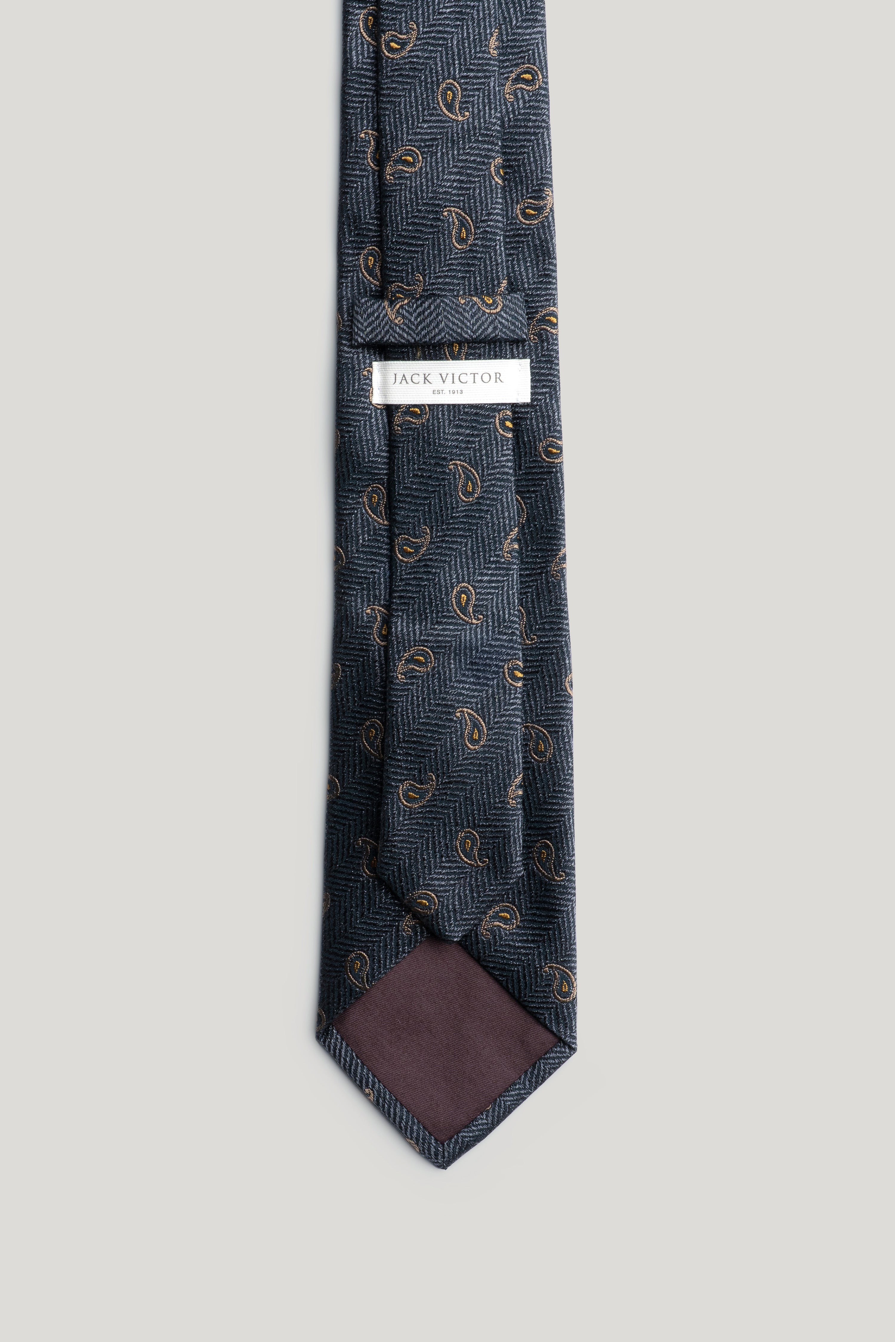 The tie features a paisley design and is woven in Italy from a very luxurious silk and cotton blend. The tie features a self-fabric keeper, and hand-finished bullion knots. The tipping fabric is the signature Jack Victor burgundy.