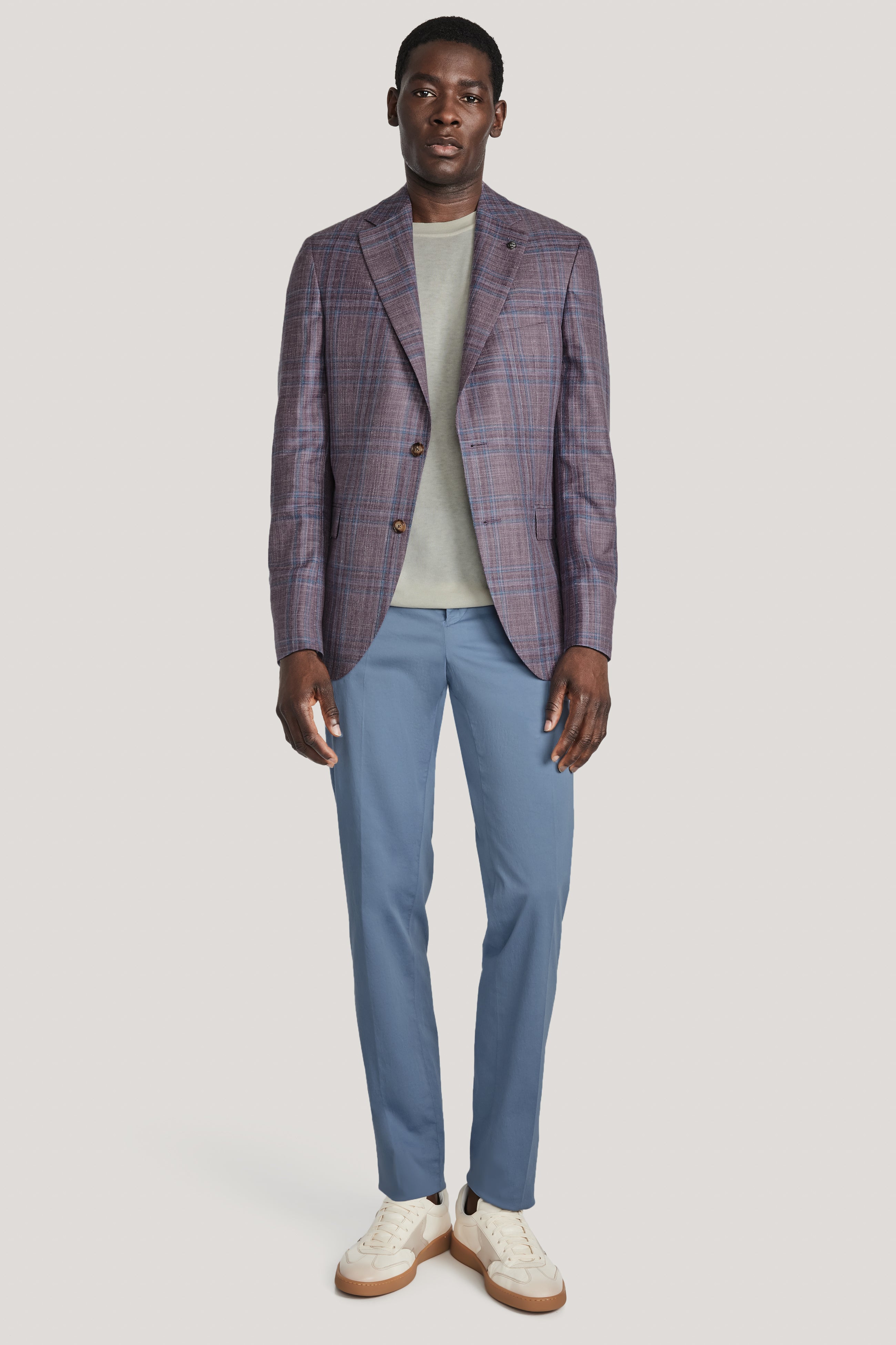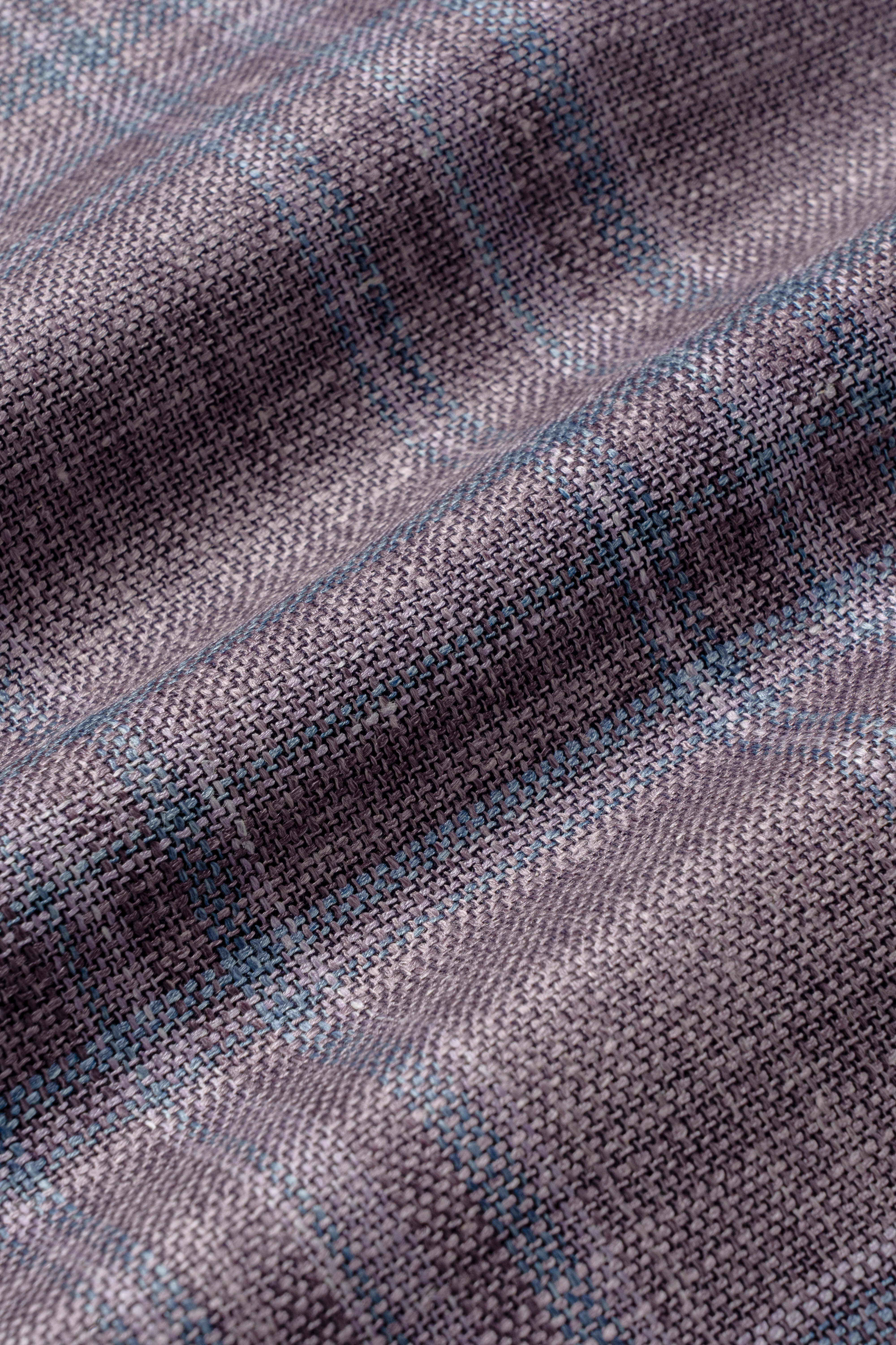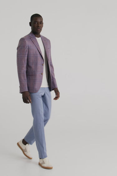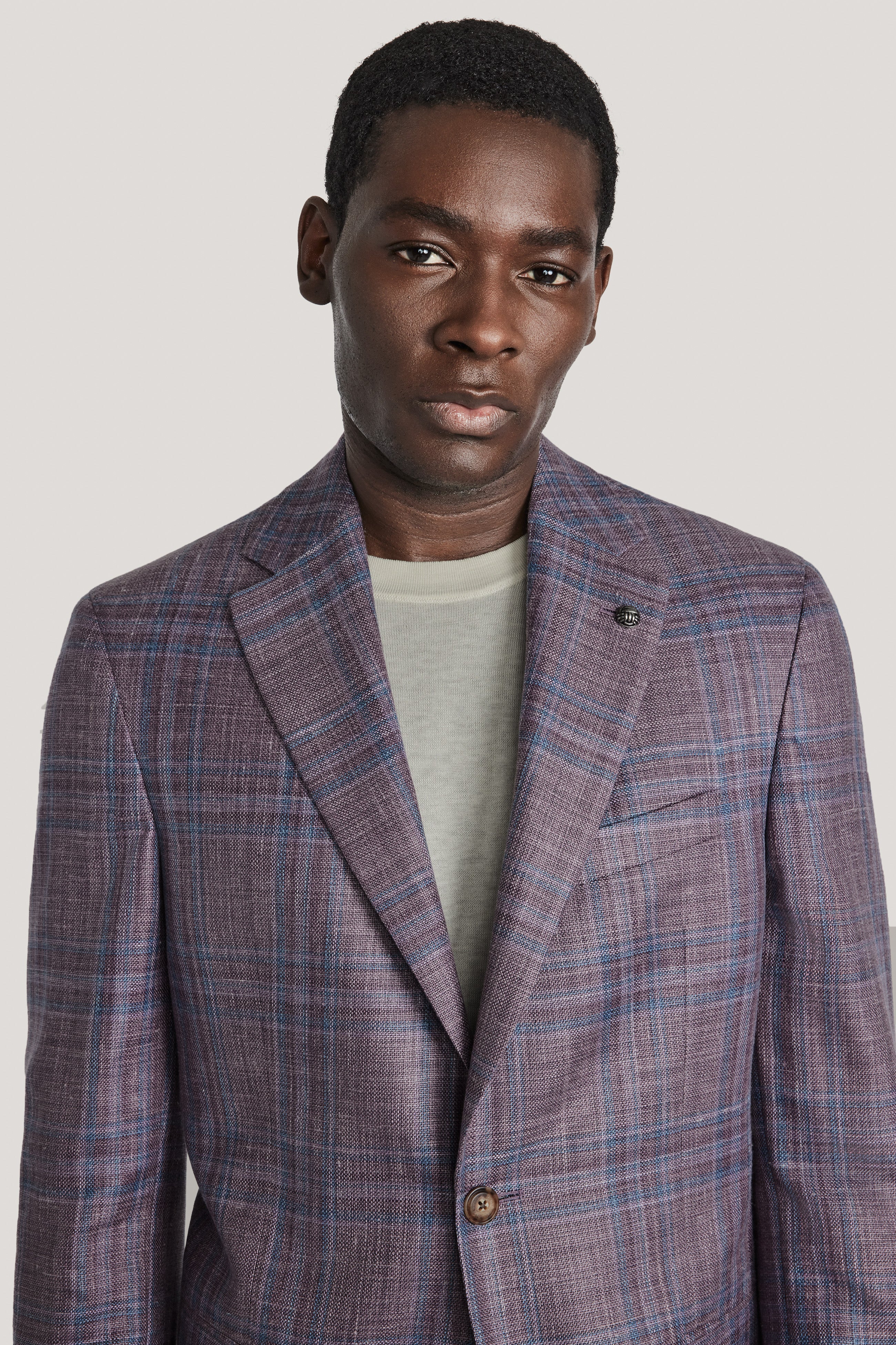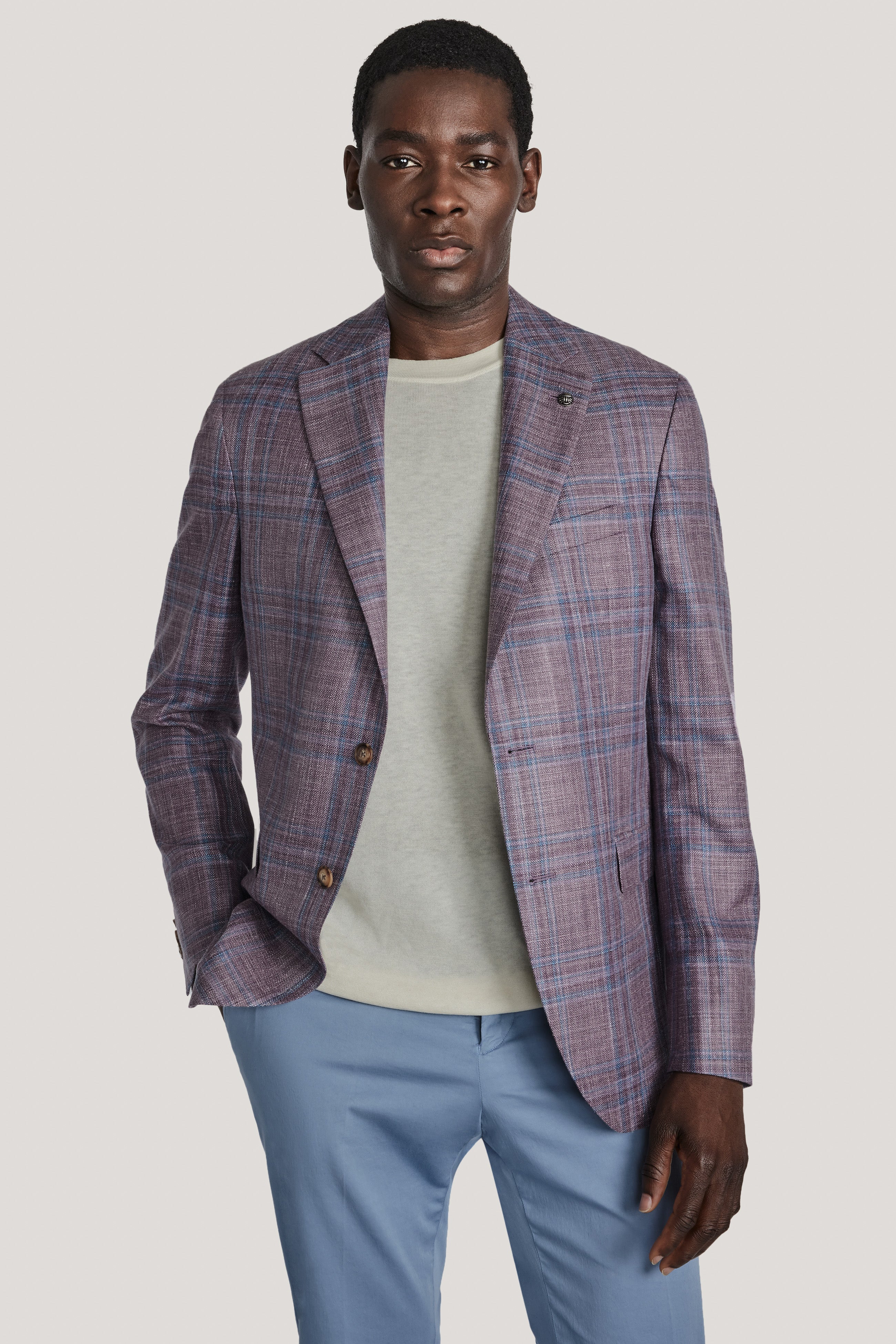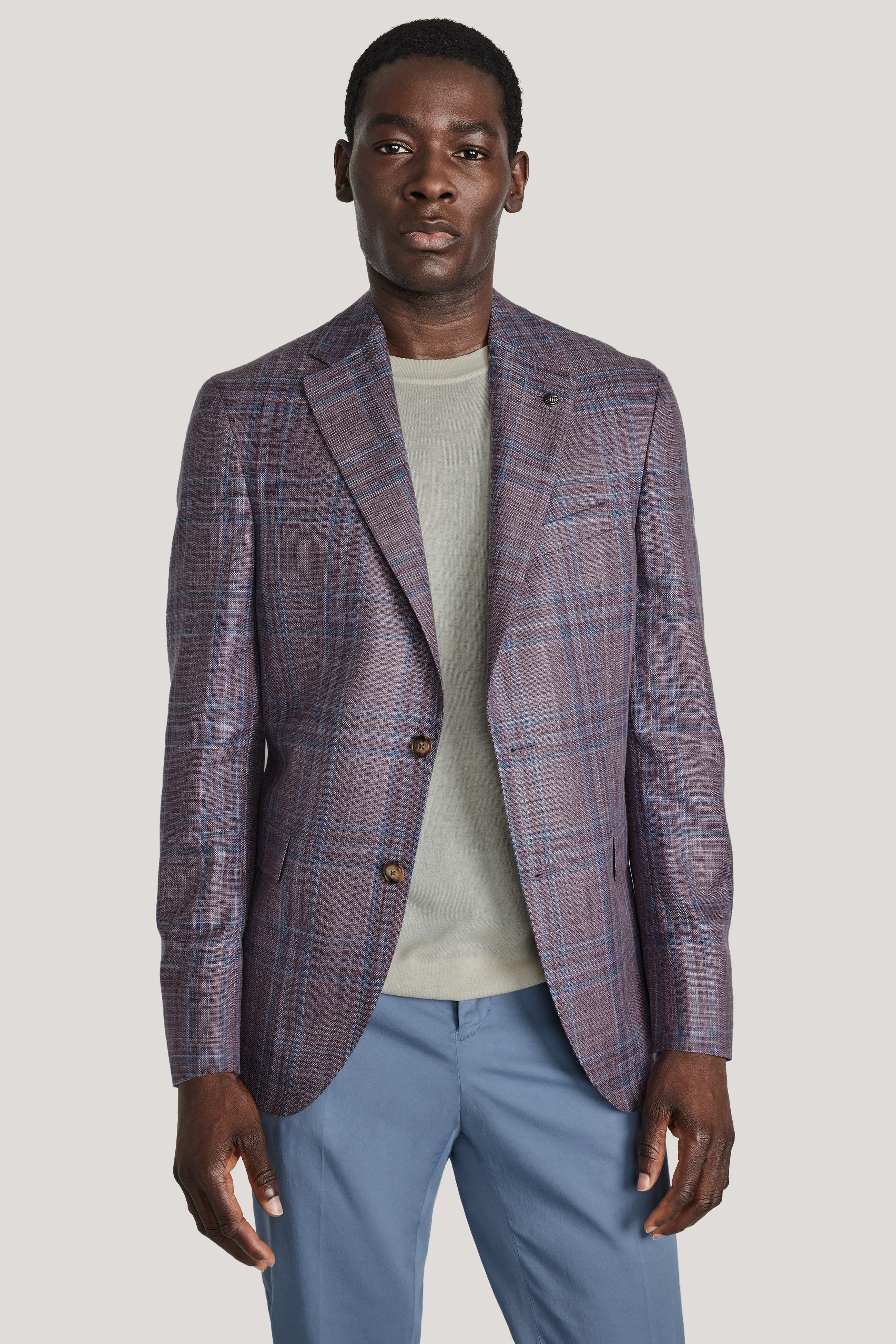 This Midland berry plaid blazer, crafted from a luxurious wool, silk, and linen blend from the Loro Piana fabric division, offers a soft, summer-ready color with a hint of texture. The single breasted, two button design features a notch lapel and lower flap pockets. Unconstructed with a half-lined interior, it ensures comfort and a relaxed style. It is the perfect lightweight jacket for summertime sophistication.