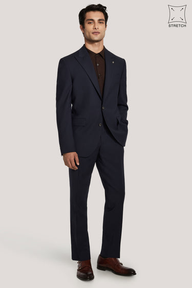 From the TEMPO Collection, this navy suit is tailored in the Engel model, offering a refined balance of comfort and structure. Crafted from a 98% wool and 2% Lycra blend woven as a Bengaline, it provides subtle stretch for ease of movement and all-day wear. The single-breasted, two-button jacket features a peak lapel, lower flap pockets, an upper welt breast pocket, and interior pockets, all finished with soft construction and a fully lined interior for a polished, modern silhouette. Ideal for both professional and formal settings, this suit delivers timeless style with everyday comfort.