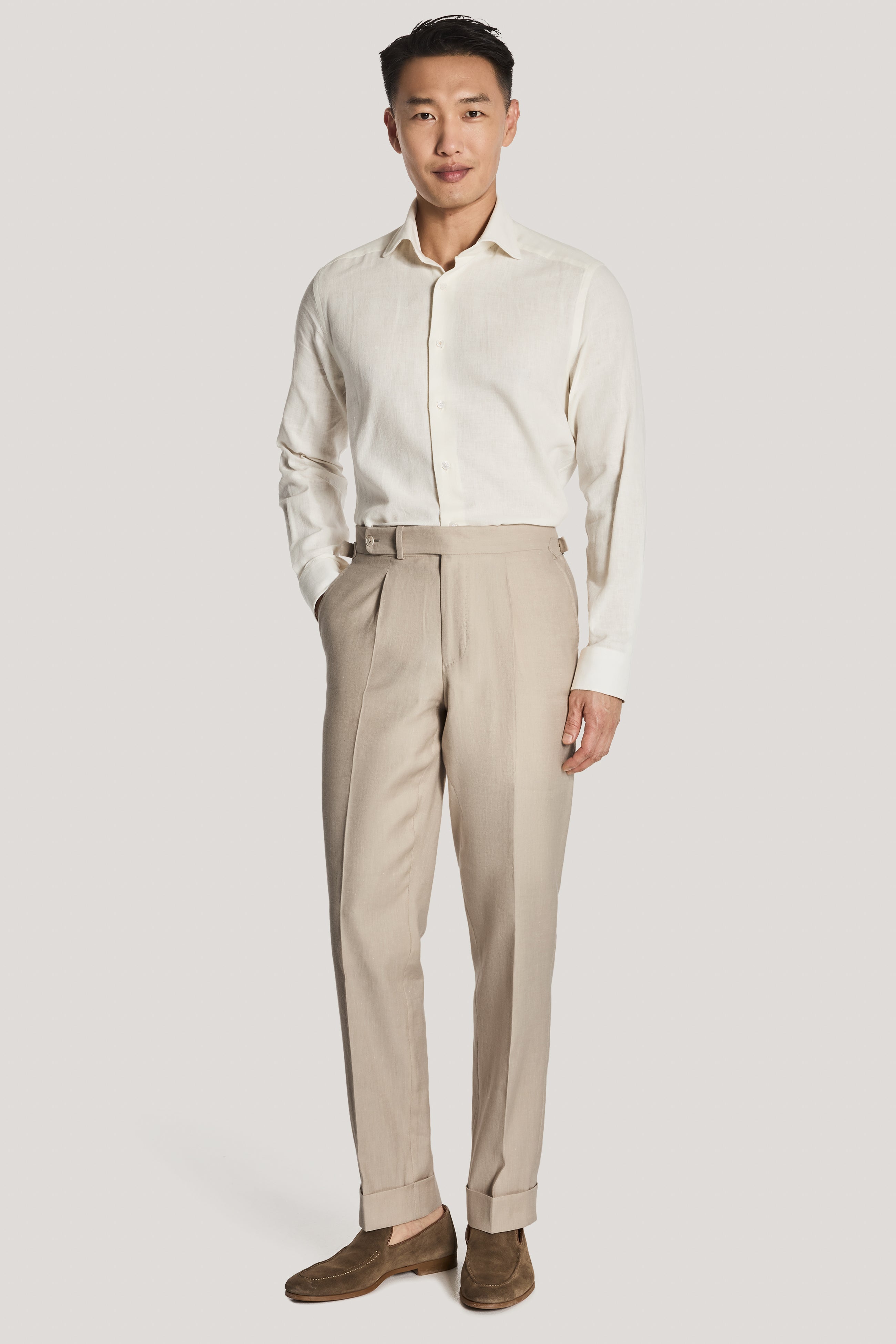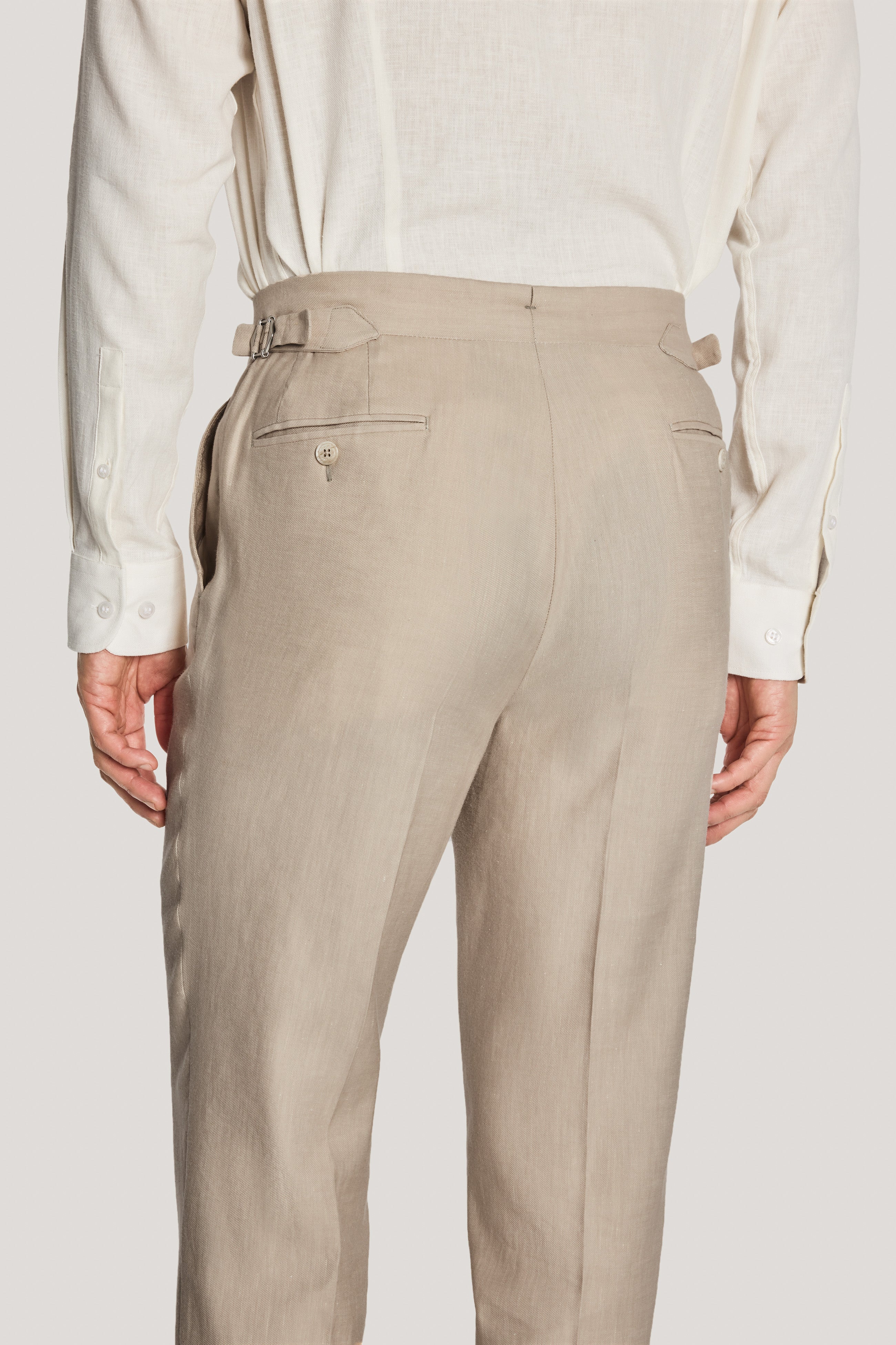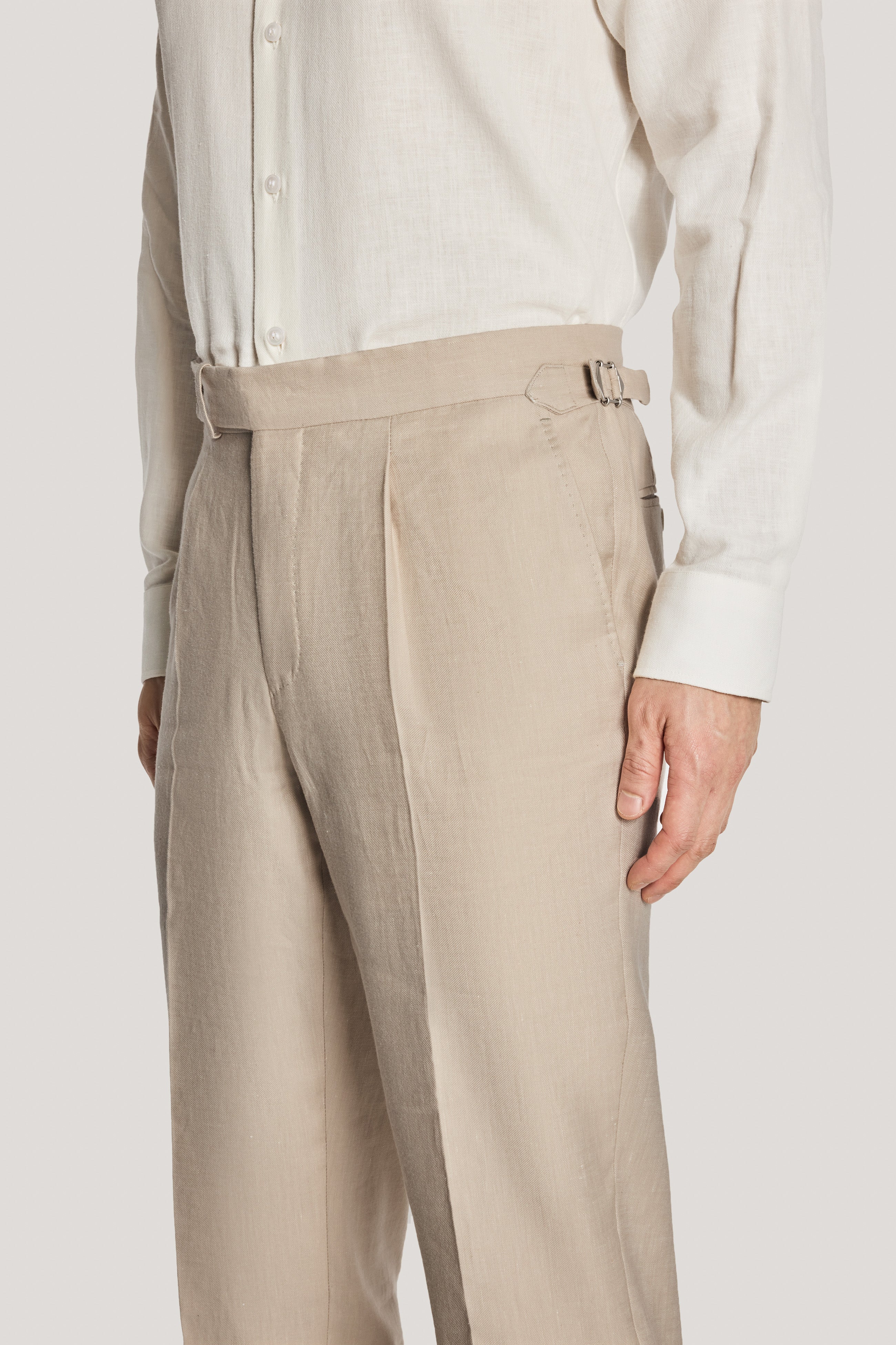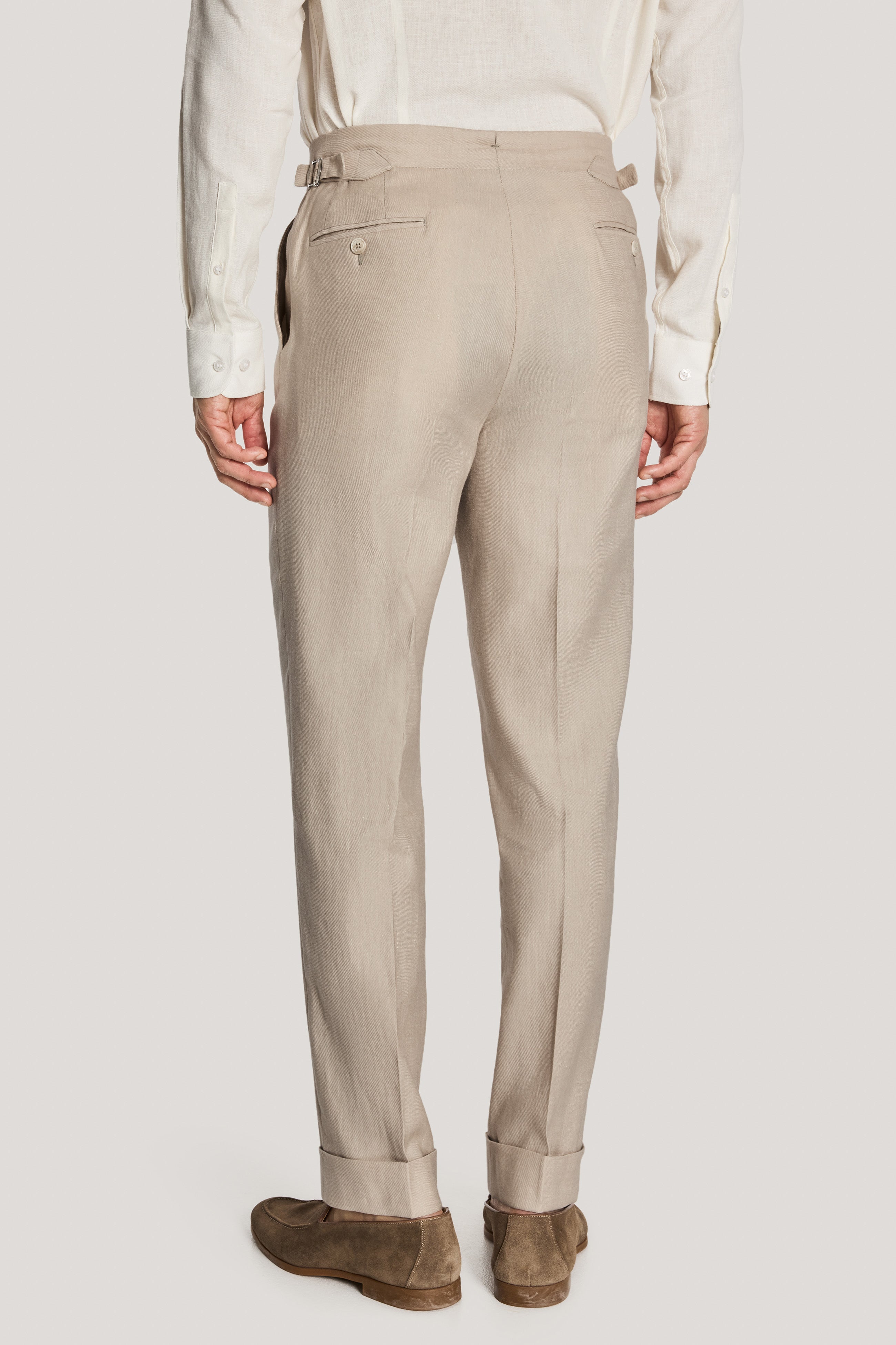 These high-rise trousers, crafted from a linen cotton blend twill, offer a roomier fit at the waist and a tapered leg for a modern silhouette. Featuring hand-stitched side tabs, a single pleat, and a button-through back pocket, they are finished with press pleats and made in Italy for a refined, tailored look.