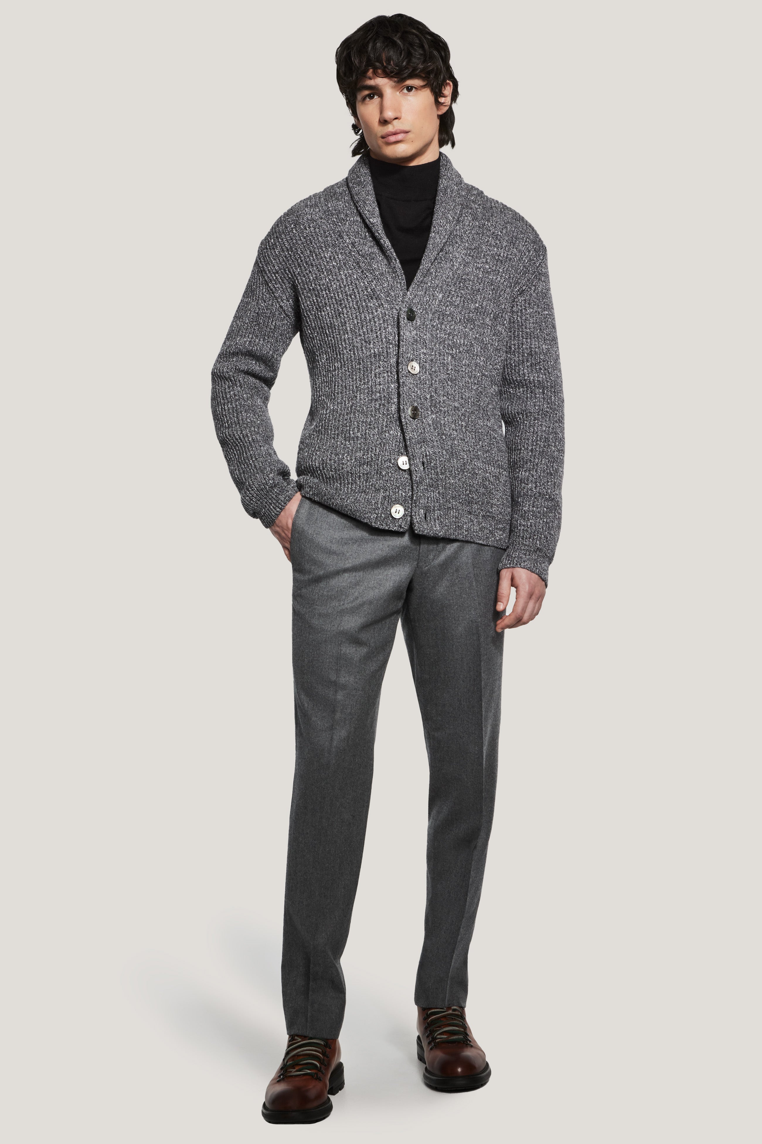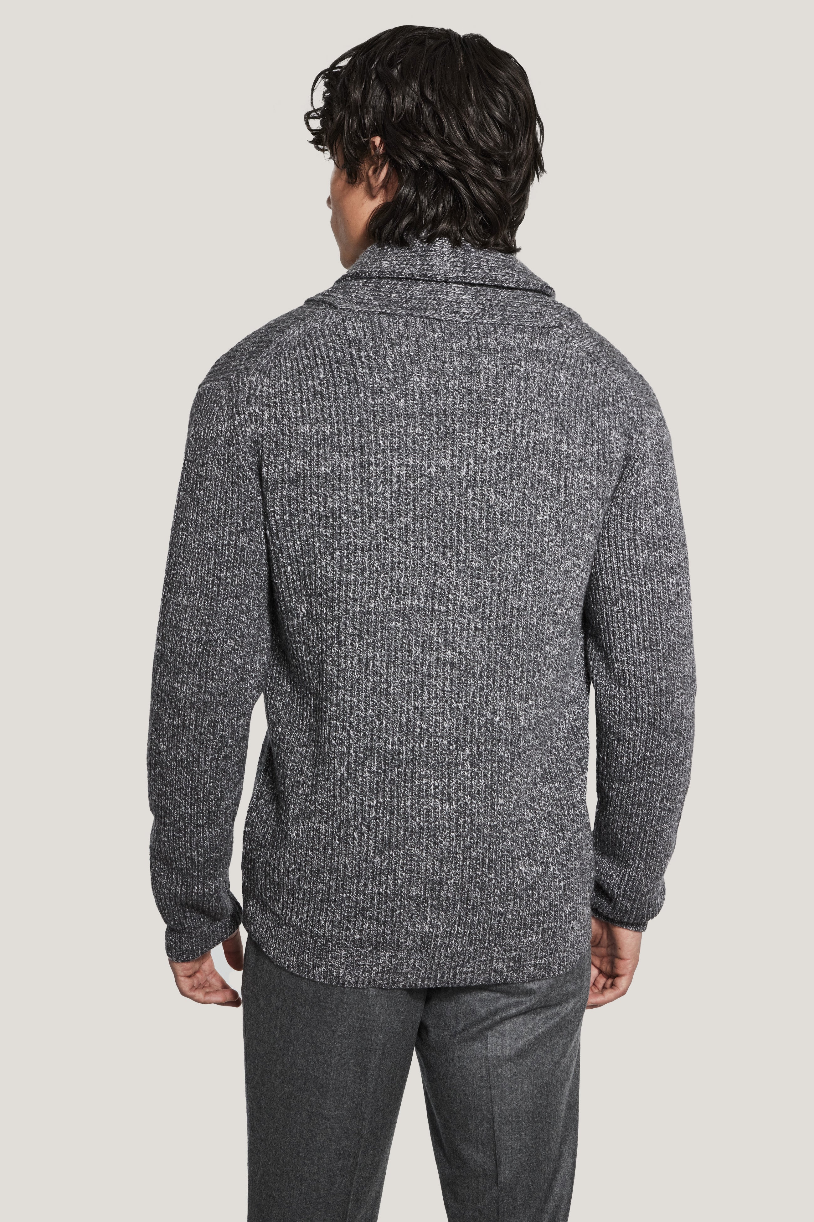 This shawl collar knit cardigan is crafted from a luxurious wool-silk blend, offering a soft, refined feel with a touch of elegance. Featuring distinctive horn buttons and a fully fashioned saddle shoulder, it provides a tailored fit with exceptional craftsmanship. The shawl collar adds a cozy, sophisticated detail, making this cardigan a versatile, stylish addition to any wardrobe.