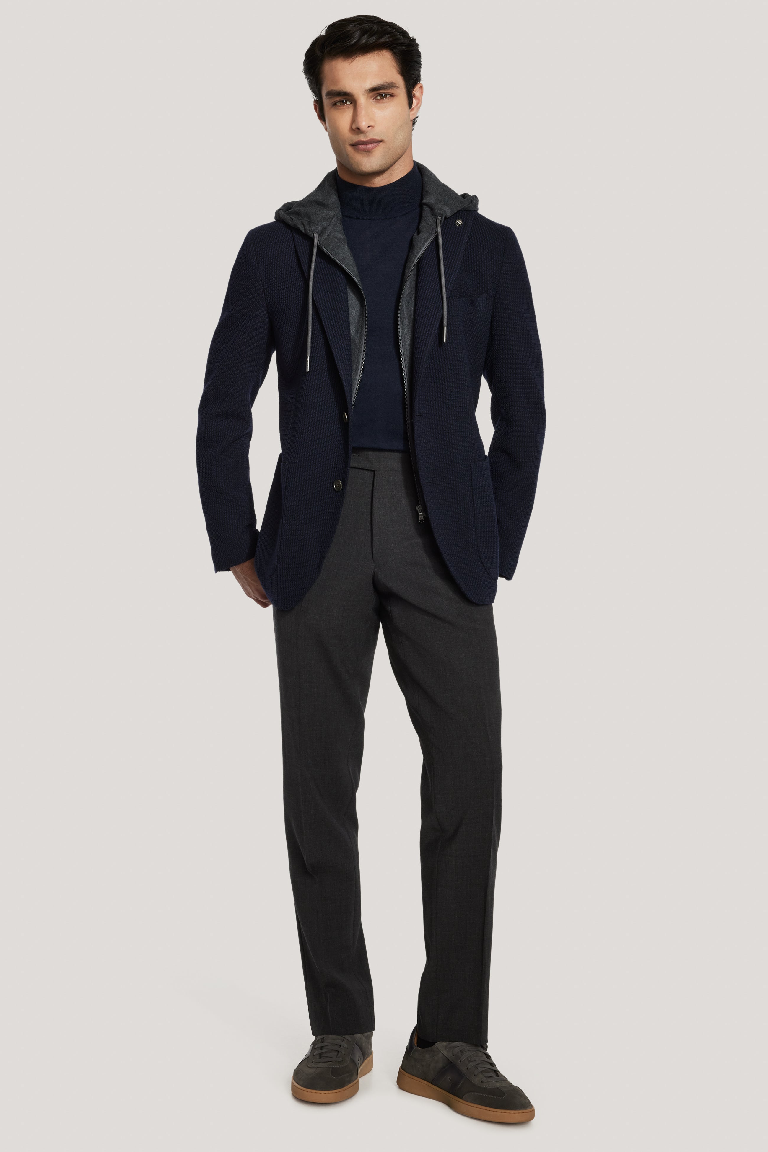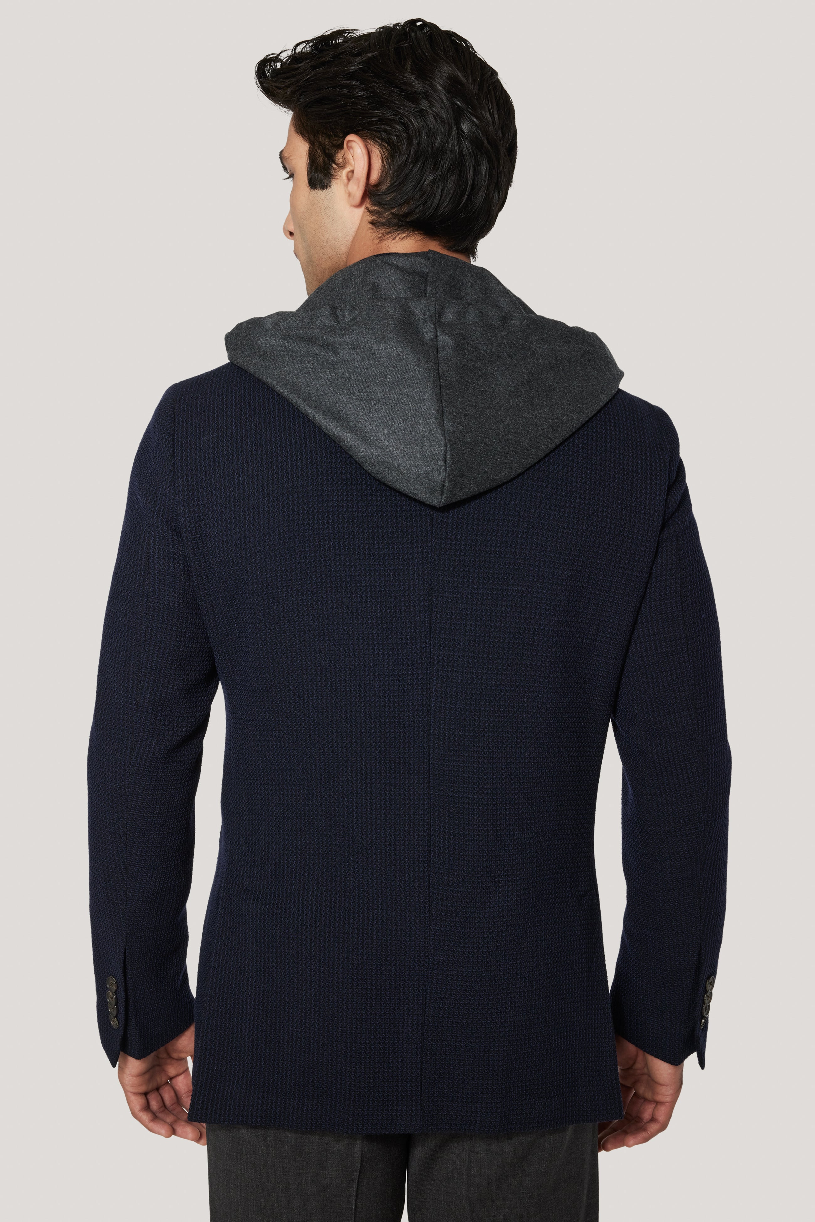 Crafted from an Italian wool waffle-knit fabric, the butterfly-lined Wolsey Blazer delivers both comfort and breathability. Designed with a removable charcoal wool flannel hooded bib, it transitions effortlessly between casual and polished looks. Wear it with a dress shirt for a refined appearance, or keep the bib for a more relaxed, laid-back style. Versatile and thoughtfully tailored, this jersey knit sports jacket is a modern wardrobe essential.